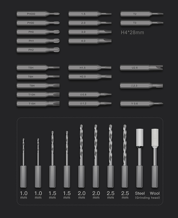 「Xcraft」の付属品として、家庭用のほとんどのニーズに対応できるS2合金鋼製の33種類のビットを用意しました。ビットは硬度が驚きの60HRCで、丈夫で長持ちします。