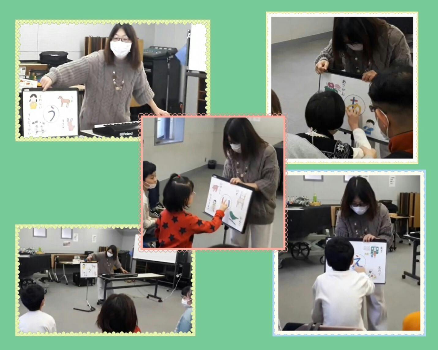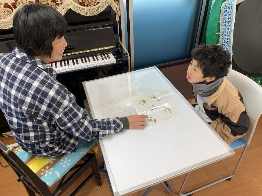発語を促すレッスンはたくさんありますが、その中でもことば音楽療法士が作った絵本「ひらがな50音」は言葉数を増やす、書き順を覚える、色を覚えるといろんな使い方があります。他に「歌って覚えるあいさつの絵本」「押してみよう」などの絵本は実際に私もレッスンで使用し、子供たちも一緒に歌って楽しく覚えてくれています。ことば音楽療法士が作った絵本がたくさんの方に広がりますように! (ことば音楽療法士より)