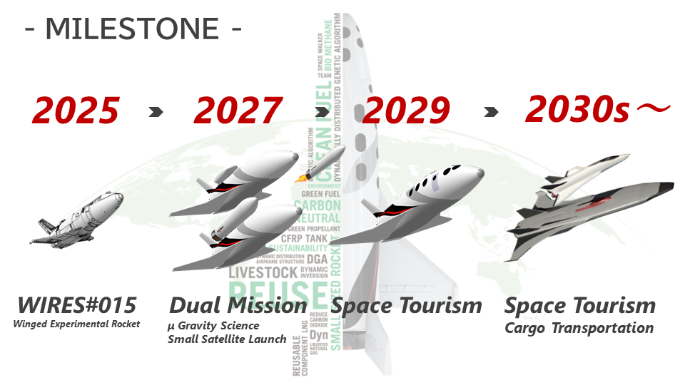 私たちSPACE WALKER の ”ECO ROCKET” が目指す最終ゴールは、持続可能な宇宙輸送システムで、誰もが飛行機に乗るように地球と宇宙を自由に行き来する未来を実現することです。東京理科大学発の大学発ベンチャーとして、大学との共同研究を中心とし大手重工メーカーやJAXAらとともに産官学連携のオープンイノベーション体制で、有翼式再使用型ロケット(スペースプレーン)の開発を進めています。そのためのマイルストンは、以下の通りです。