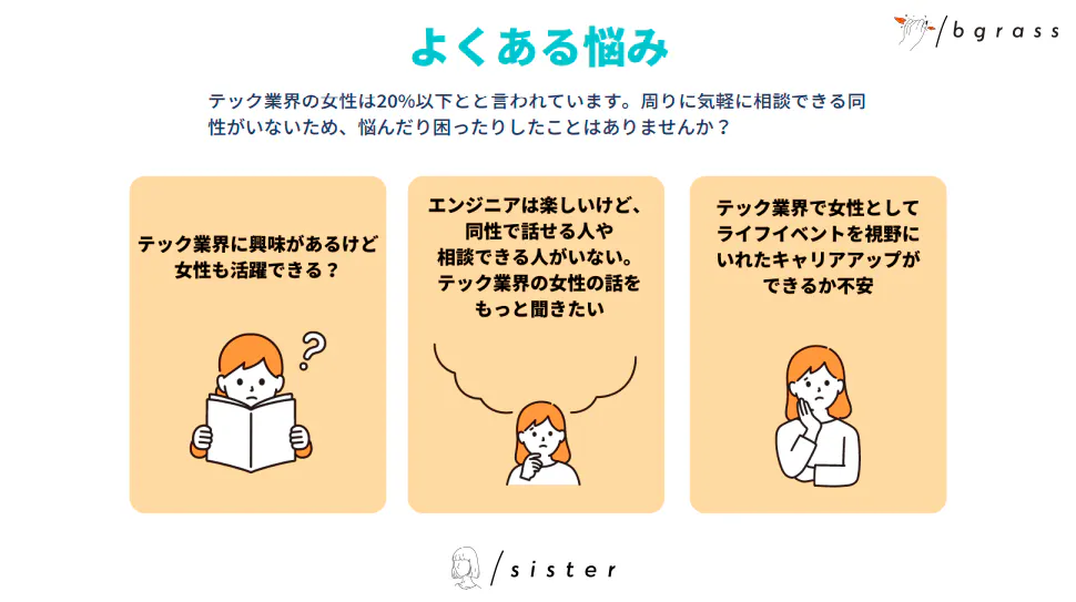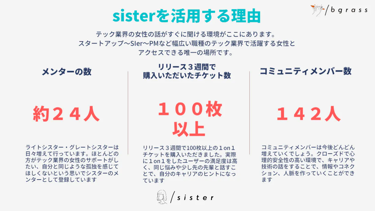 個人開発で始まりましたが、今回bgrass株式会社を立ち上げ、改めてリニューアルしたsisterをリリースしました。社会や企業を巻き込み、本気でテック業界のジェンダーギャップ解消に取り組んでいきます。