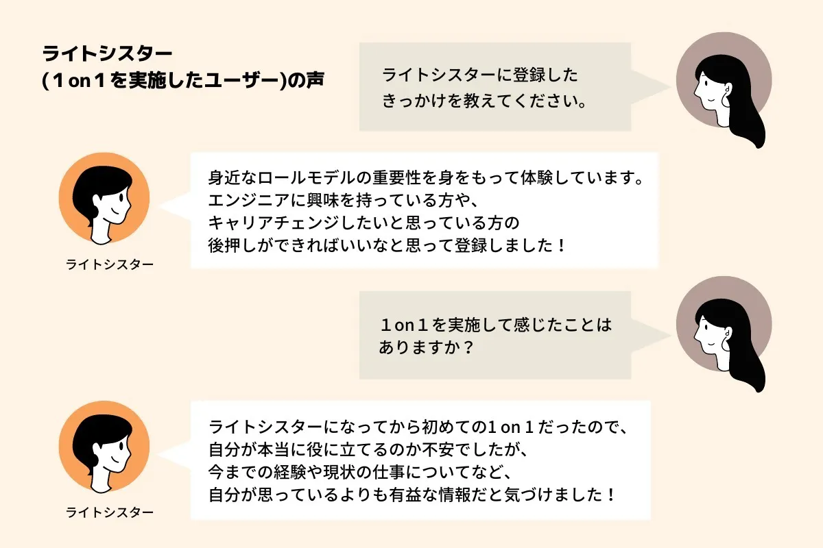 ・ライトシスター:テック業界の女性エンジニアとカジュアルな1on1を実施します。 少し先のキャリアを歩む先輩に、気軽に相談したい方におすすめです。