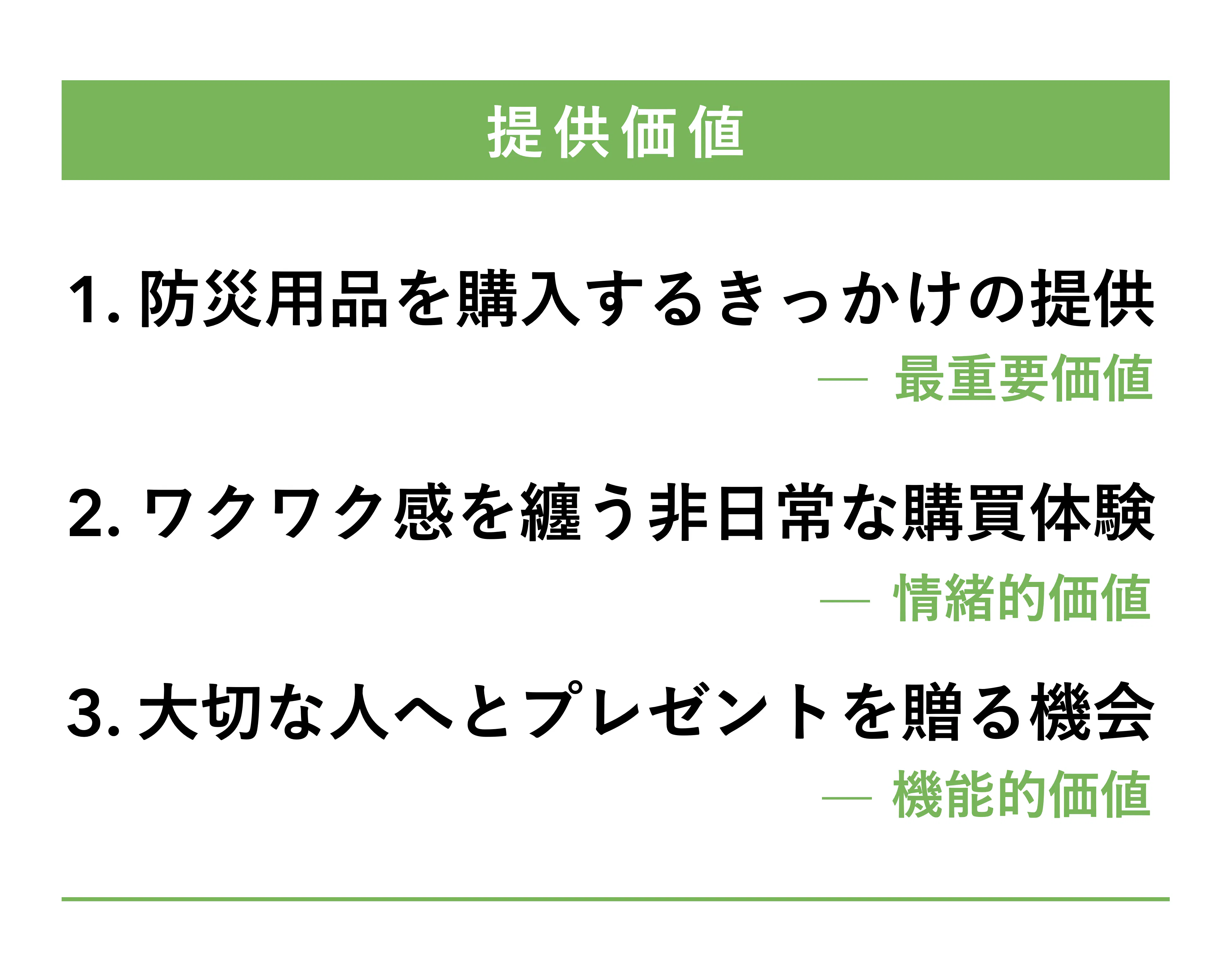 その価値への深い理解が促され、防災用品の必要性を実感、購買意欲が高まることを最終的な狙いとして定めています。