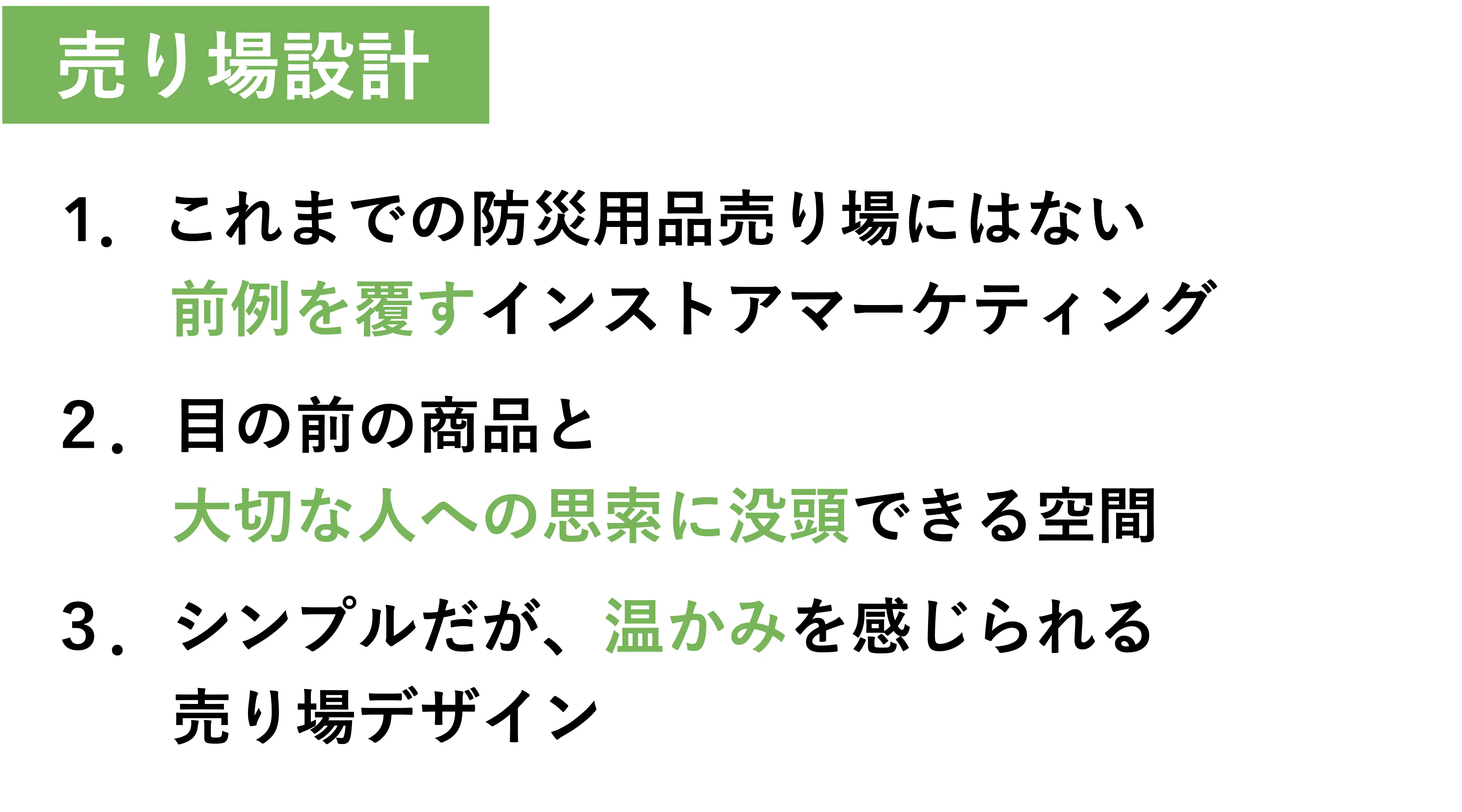 つまり、リアルで開催するポップアップストアは、主婦層をコアターゲットとして置き、同時にメディアやSNSでの拡散から、今後展開していくECサイトへの動線を敷き、防災用品の購入へと導いていくということを実現していきます。