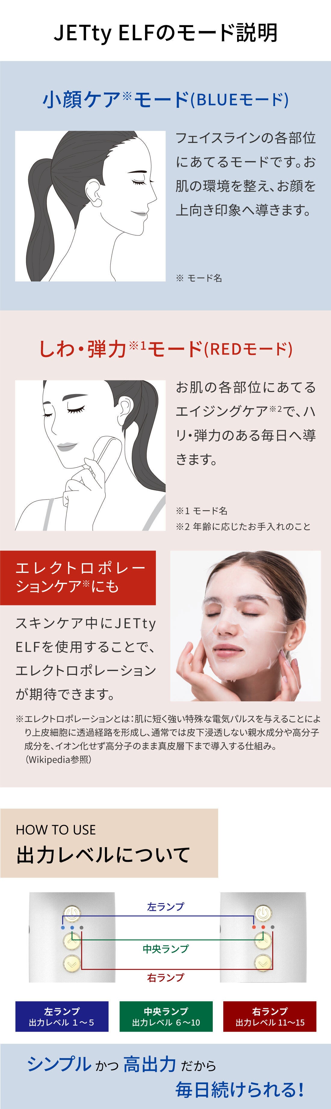 3.モード選択後、ヘッド部を肌にあて、肌の状態に合わせ出力レベルを調整します。