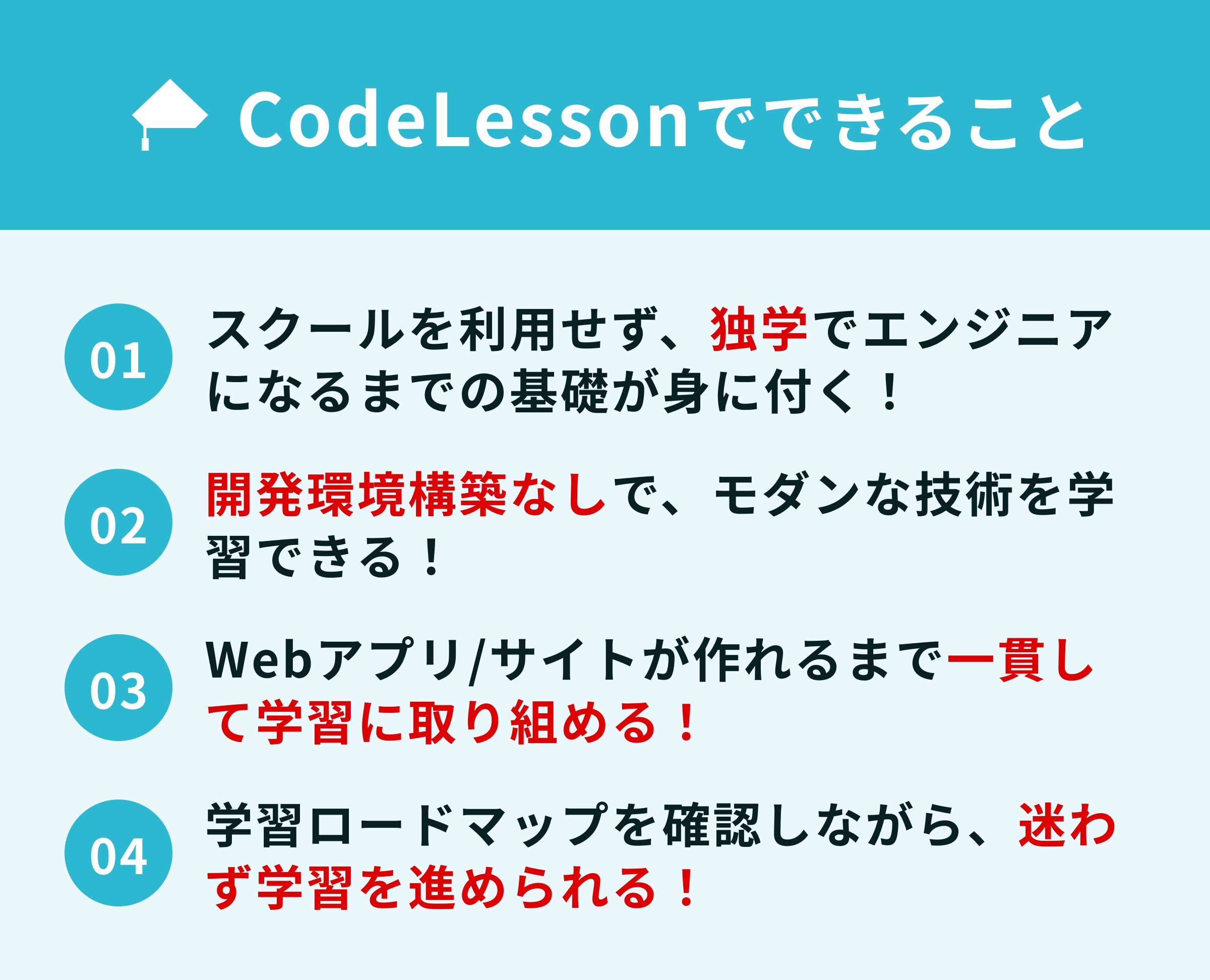 CodeLessonでは、700名以上のエンジニアになりたい方々にヒアリングした結果、下記4つにこだわって実装しました。