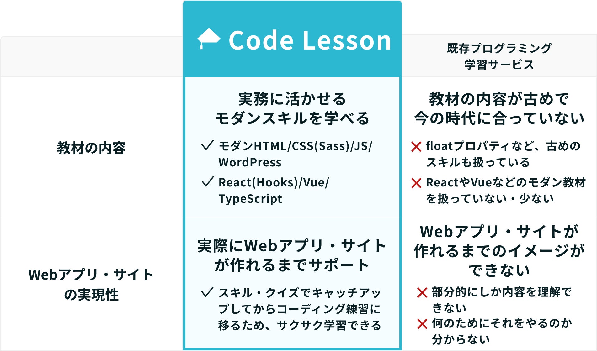 CodeLessonでは、それらの課題を解決するため以下のことに焦点を当てています。