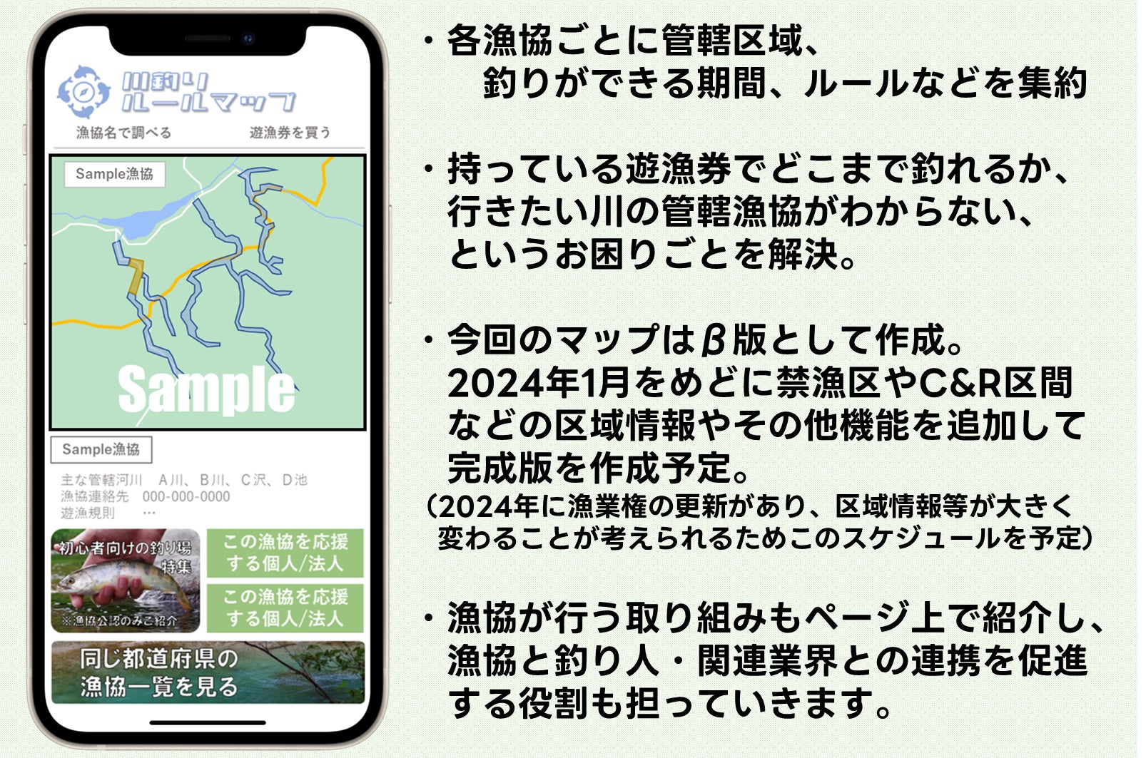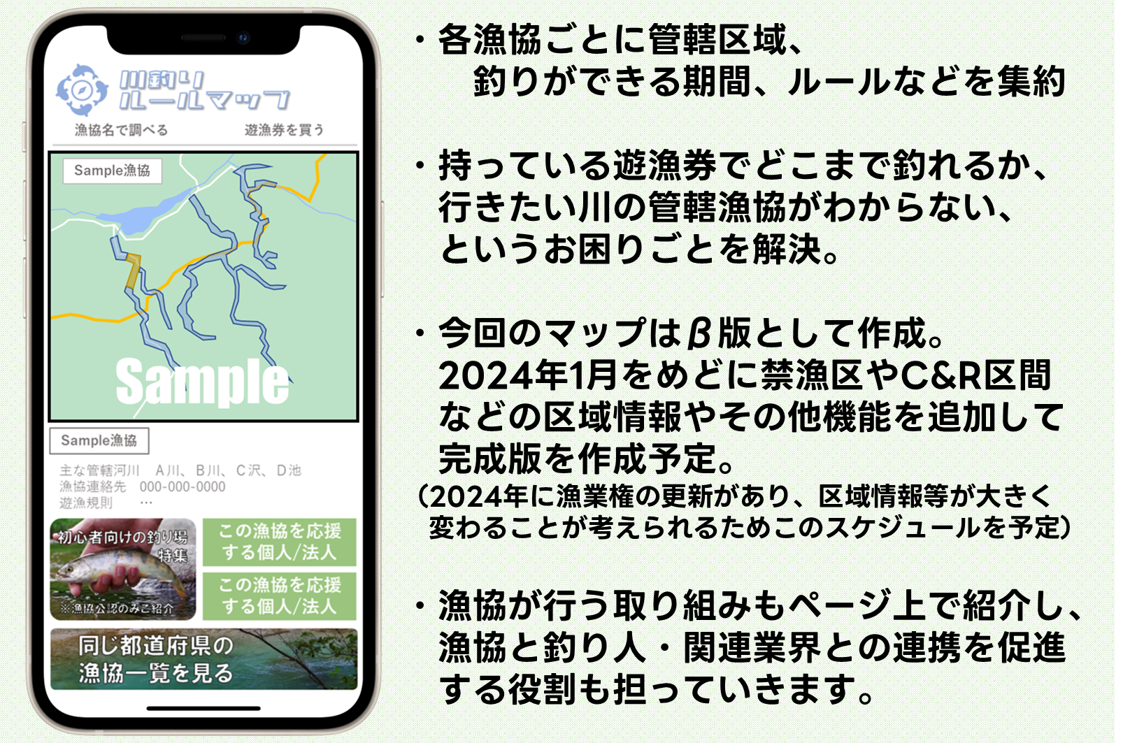 今回のプロジェクトでは、各河川・湖沼のルールが集約され、わかりやすく表示された全国各地のルールをまとめたオンライン「川釣りルールマップ」のβ版を作成します。(2023年3月公開予定。なお、作成、管理団体確認状況によっては都道府県ごとの順次公開になる可能性があることをご容赦ください。)