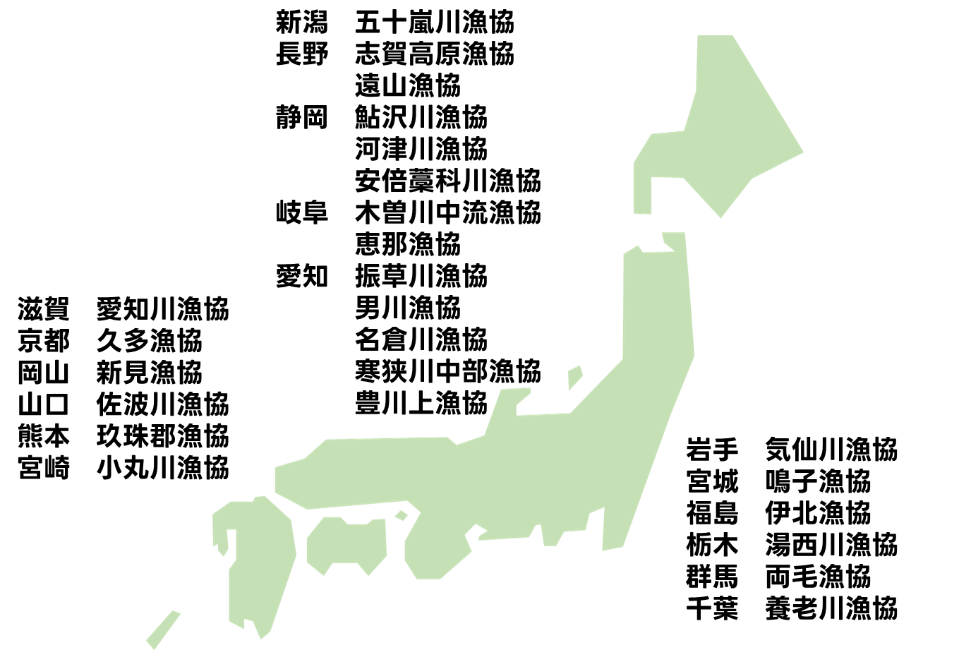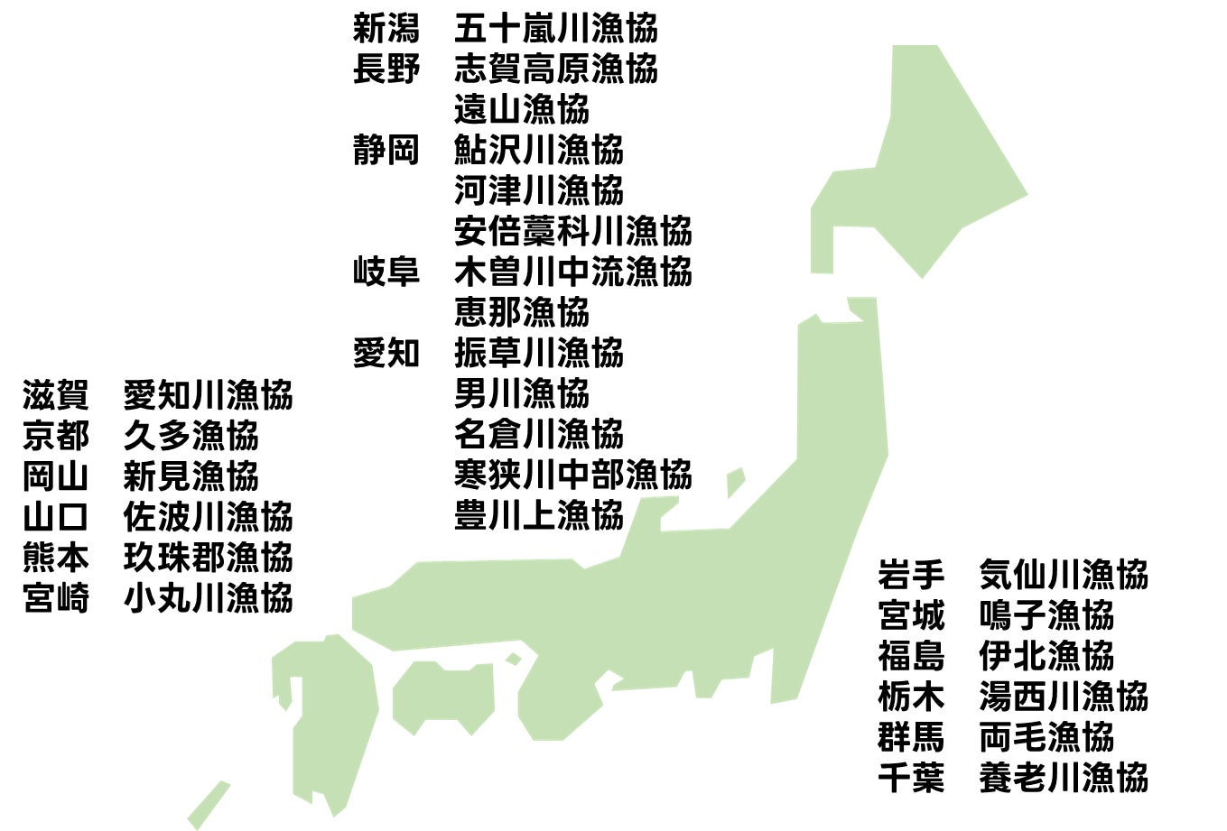気仙川漁協、鳴子漁協、伊北漁協、湯西川漁協、両毛漁協、養老川漁協、五十嵐川漁協、志賀高原漁協、遠山漁協、鮎沢川漁協、河津川漁協、安倍藁科川漁協 、木曽川中流漁協、恵那漁協、男川漁協、振草川漁協、名倉川漁協、寒狭川中部漁協、豊川上漁協、愛知川漁協、久多漁協、新見漁協、佐波川漁協、玖珠郡漁協、小丸川漁協(都道府県順)