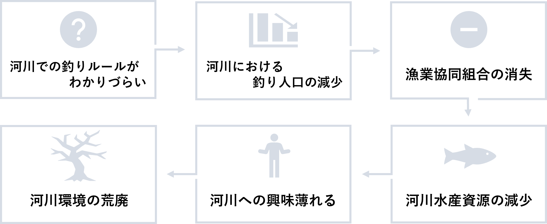 負のサイクルを止めて、将来の世代が河川・湖沼で釣りを楽しめる環境を残せるように。その第一歩として、「川釣りルールマップ」を作成します。