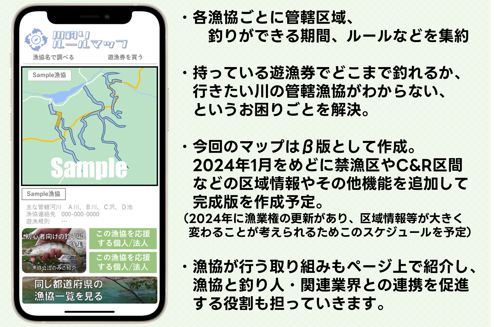 今回のプロジェクトでは、各河川・湖沼のルールが集約され、わかりやすく表示された全国各地のルールをまとめたオンライン「川釣りルールマップ」のβ版を作成します。(2023年3月公開予定。なお、作成、管理団体確認状況によっては都道府県ごとの順次公開になる可能性があることをご容赦ください。)