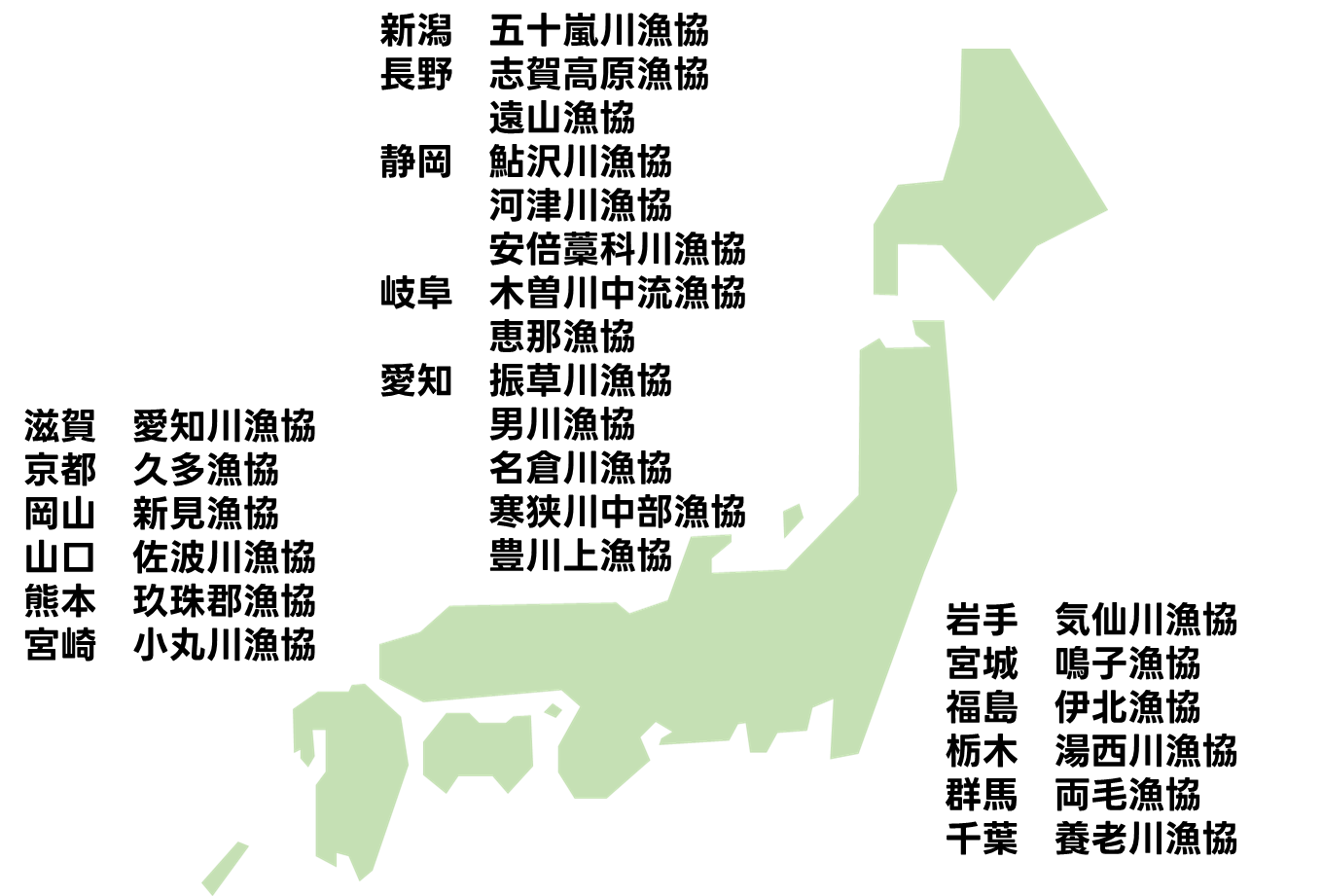 気仙川漁協、鳴子漁協、伊北漁協、湯西川漁協、両毛漁協、養老川漁協、五十嵐川漁協、志賀高原漁協、遠山漁協、鮎沢川漁協、河津川漁協、安倍藁科川漁協 、木曽川中流漁協、恵那漁協、男川漁協、振草川漁協、名倉川漁協、寒狭川中部漁協、豊川上漁協、愛知川漁協、久多漁協、新見漁協、佐波川漁協、玖珠郡漁協、小丸川漁協(都道府県順)
