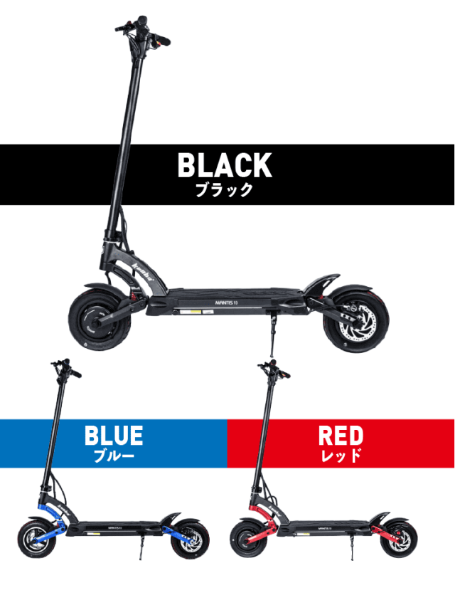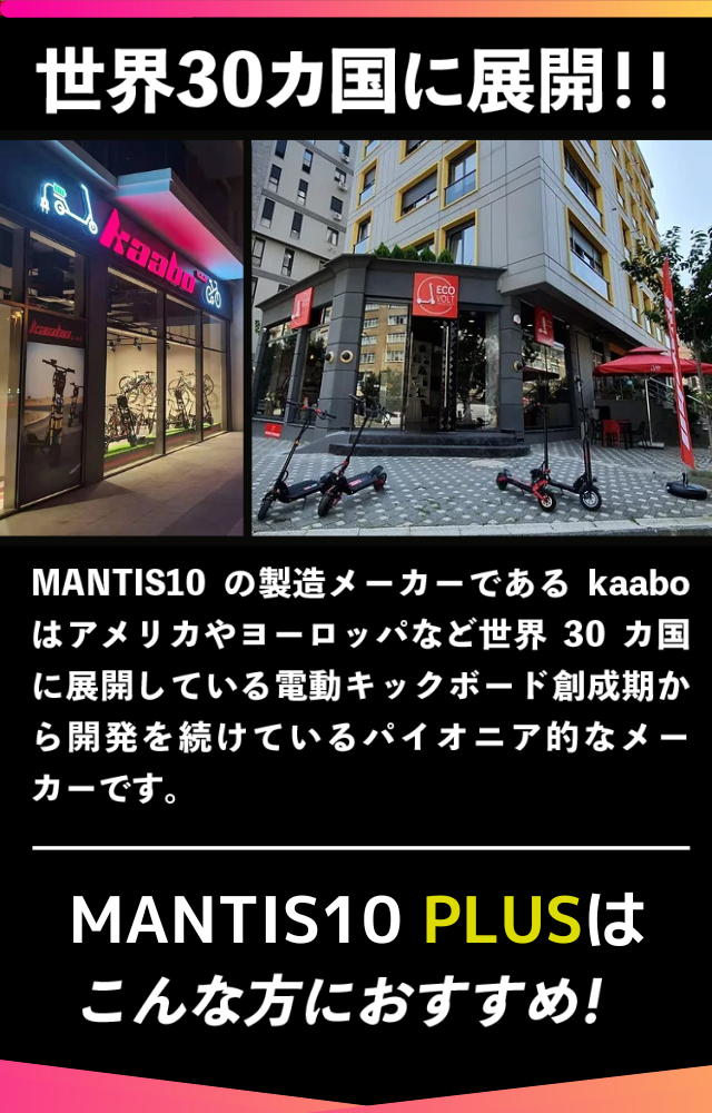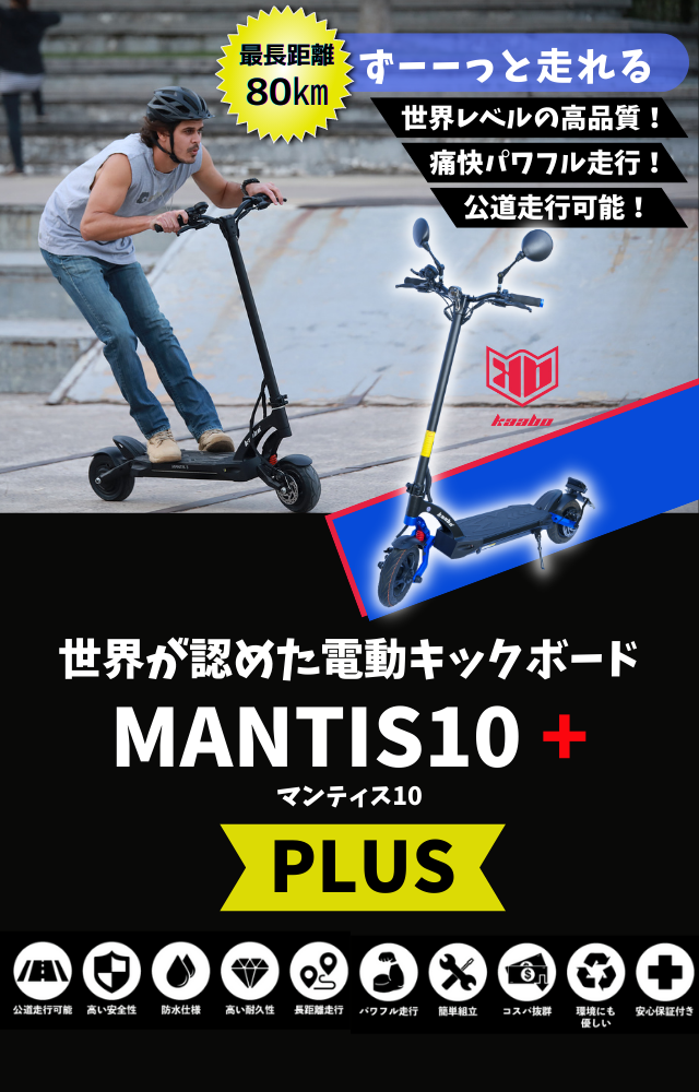 海外では数年前からポピュラーな電動キックボードも、日本では最近徐々に普及し始めてきました。こんな便利な移動手段を日本でも安全に楽しく使われたらいいな、という思いから、すでに海外で実績がある安全性、品質が優れたかっこいい電動キックボードを探していたところ、kaabo社のMANTIS(マンティス)に出会いました。形がカマキリに似ていることからこの名が付いたそうです。MANTISは世界30か国以上ですでに実績があり、世界中に多くのMANTIS愛好家がいる電動キックボードですが、まだ日本では販売されていなかったことから、弊社は日本のこれからの未来にぜひMANTISを普及させたいという思いで、メーカーであるkaabo社に連絡を取り、MANTISを日本の保安基準に沿った日本の公道仕様モデルにして、日本で販売することに成功しました!高品質な電動キックボードを求めている方々に、これから電動キックボードに乗り始める方に、MANTIS10 PLUSを使用していただけるようチャレンジいたします!