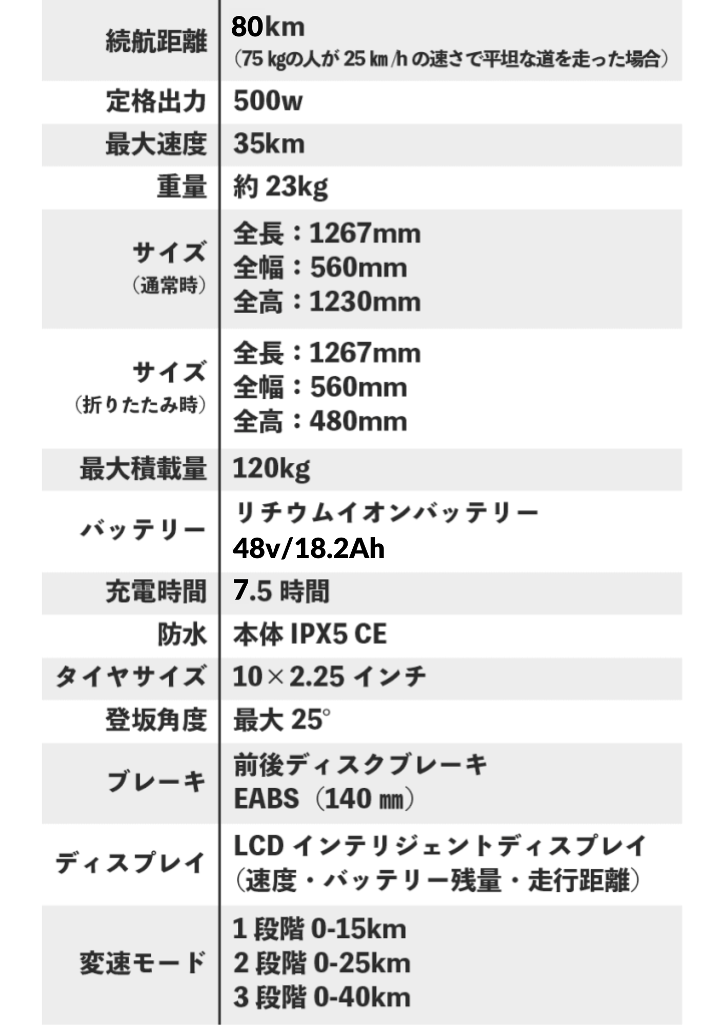 ボディの長さは1267mmと一般的な電動キックボードより、若干長めの仕様で、安定した走りを実現します。