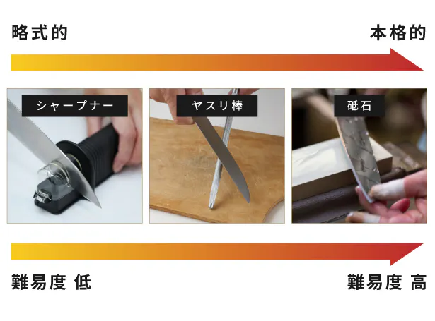 どちらにもメリットはあるのですが、料理人にとっては「新品時の切れ味に戻せる」程の精度が必要、つまり砥石でなければならないのです。包丁の切れ味一つで食材の味が変わる、そのこだわりこそプロの仕事です。