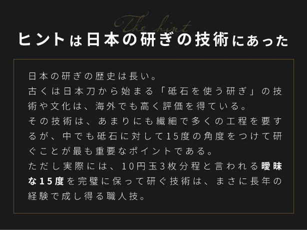 開発者は、日本の研ぎの歴史から、日本の職人技を学び、そしてあるアイデアを思いつくのです。
