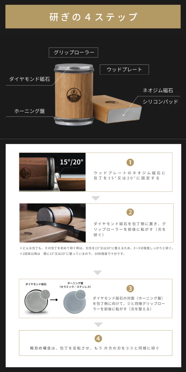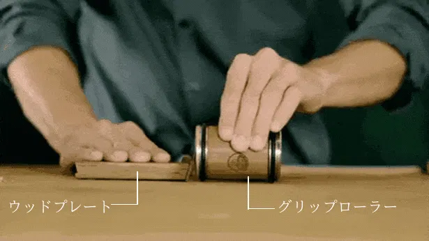 ロールシュライファーは、包丁を研ぐためのグリップローラーと包丁を支えるためのウッドプレート、この2つの相互作用によって包丁を研ぐツールです。