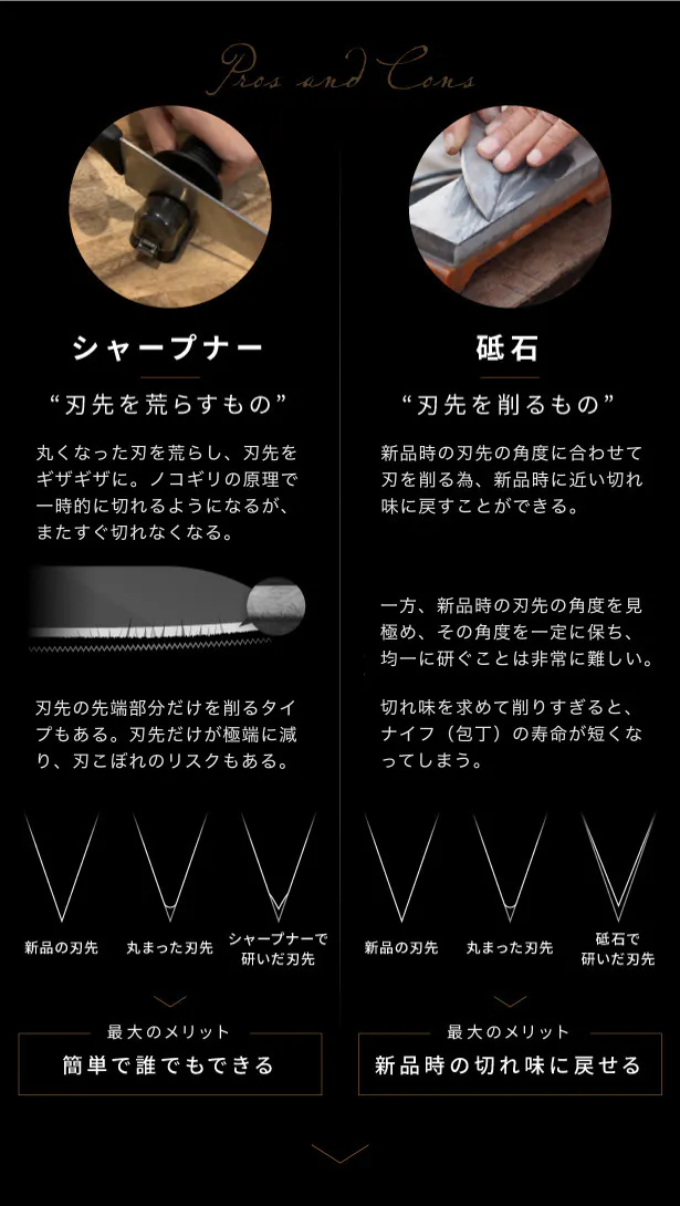 どんなに優れた商品が出ても、プロの料理人が「シャープナーを使って包丁を研ぐ」姿は、あまり見たことがありません。今も昔も、なぜプロの料理人は、「砥石を使って包丁を研ぐ」のか。
