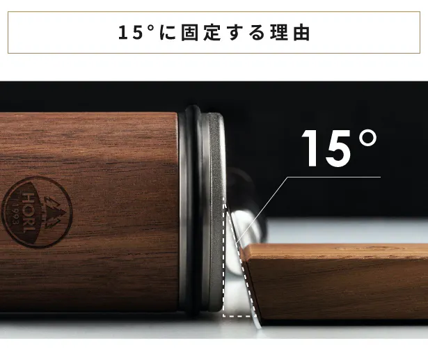 15°の角度には理由があります。包丁には、様々な素材、用途、大きさのものがあります。ですが、海外の包丁も日本の包丁も、実は、ほとんど全ての包丁は13°〜17°の角度に刃付けされている、と開発者は言います。