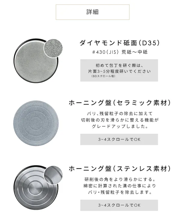必要に応じてプレートを取替えれば、荒砥 ▷ 中砥 ▷ 仕上げ砥 の順に研ぎ進めることが可能です。これも、プロの料理人が日常で使う理由の一つです。