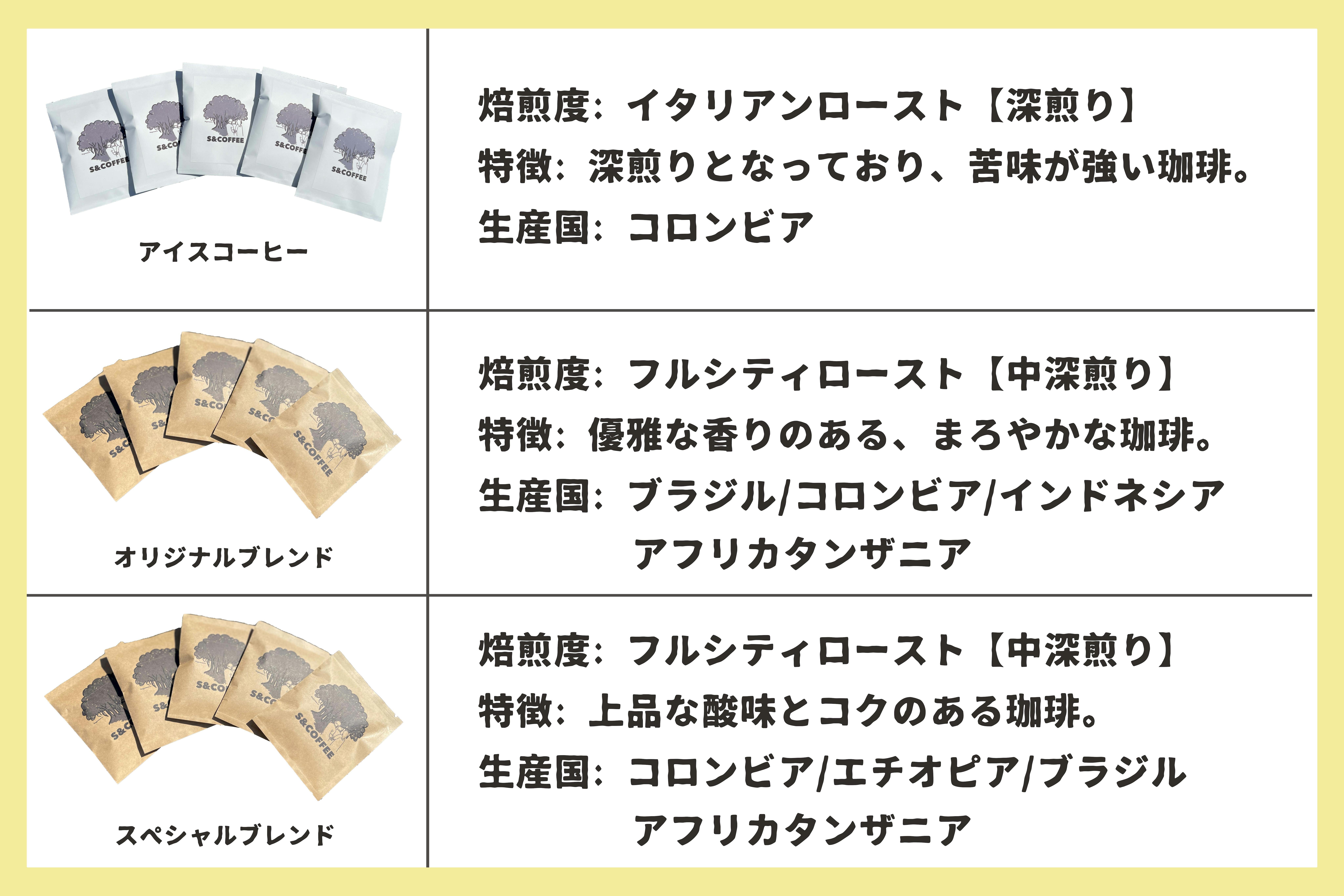 S&COFFEEで既存販売している、アイスコーヒーとホットの「オリジナルブレンドコーヒー」、 クラウドファンディング限定で販売予定のホットの「スペシャルブレンドコーヒー」があります。