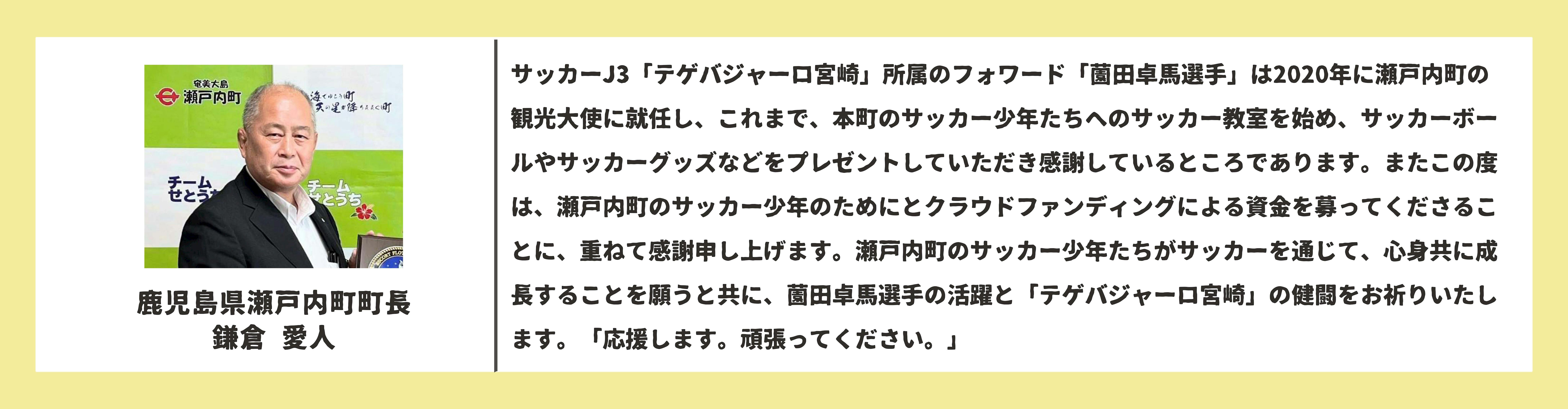 初めまして、プロサッカー選手(テゲバジャーロ宮崎)と奄美大島瀬戸内町観光大使を務めています薗田卓馬(そのだたくま)と申します。1993年6月14日生まれの29歳です。