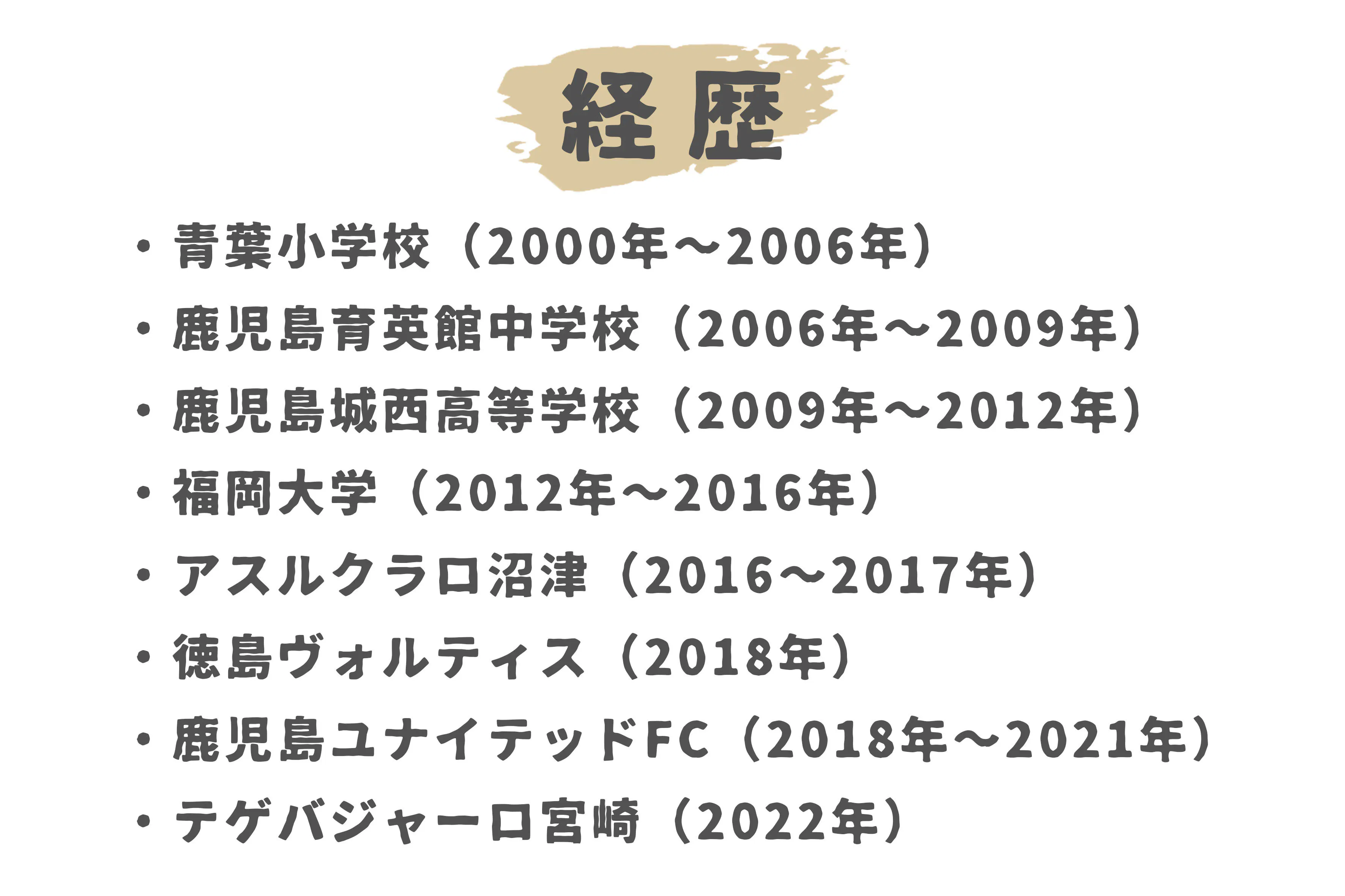 私は奄美大島で生まれて3歳から鹿児島県霧島市で育ちました。サッカーをするきっかけは兄がサッカーをしていた影響で4歳からサッカーを始めました。小さい頃からの憧れの選手はゴンさん(中山雅史)であり、ゴンさんみたいなプロサッカー選手になりたいとずっと夢を持ち続けていました!