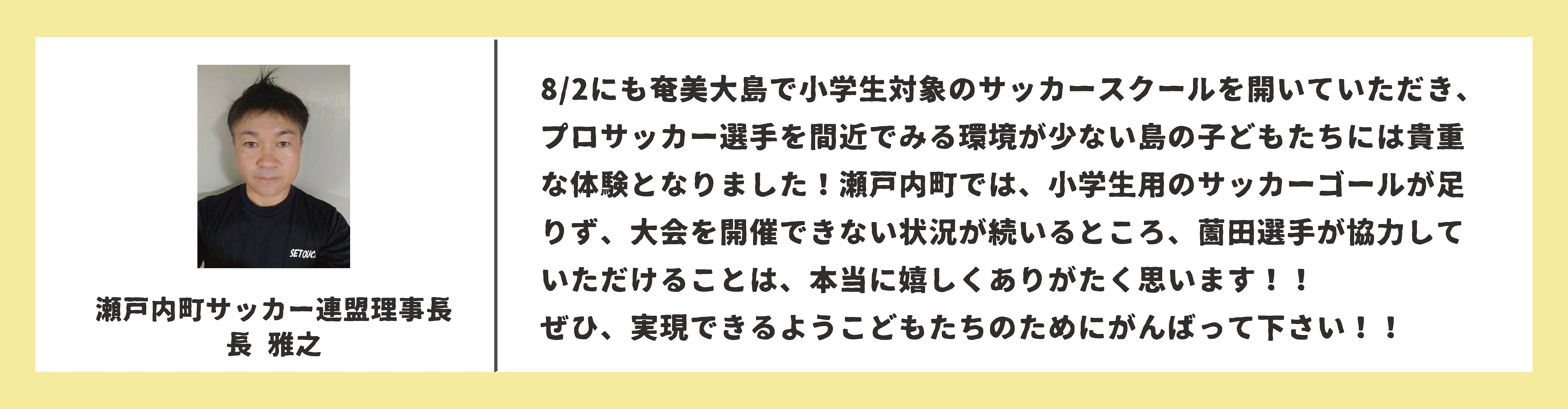 今年の8月に観光大使として瀬戸内町でサッカースクールをした際に、コーチや親御さん、子どもたちから「試合をもっとしたい」「大会が少ない」「瀬戸内で試合がしたい」という現場の声を聞くことができました。
