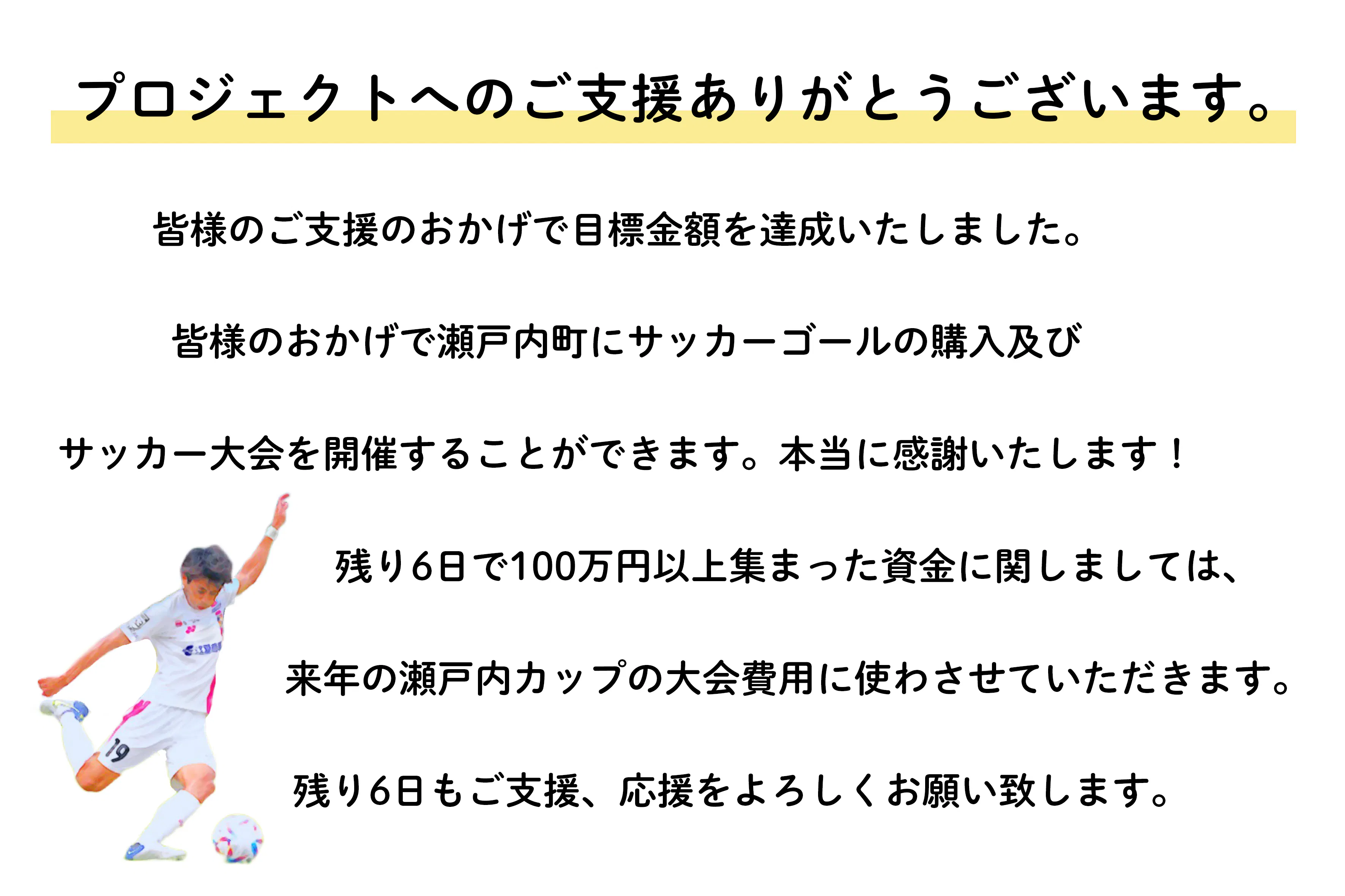 2022/12/12 15:00皆様のご支援のおかげでサッカーゴールを購入することができて、12月11日(日)に瀬戸内カップを無事開催することができました。子どもたちが一生懸命に楽しくサッカーする姿がみることができました。来年もサッカー大会を開催できるに頑張りたいと思います。 もっと見る