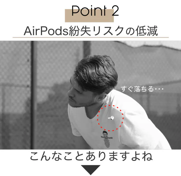 AirPodsをネックストラップ型として使用できるので、激しい運動をしても落下し紛失するリスクが激減します。