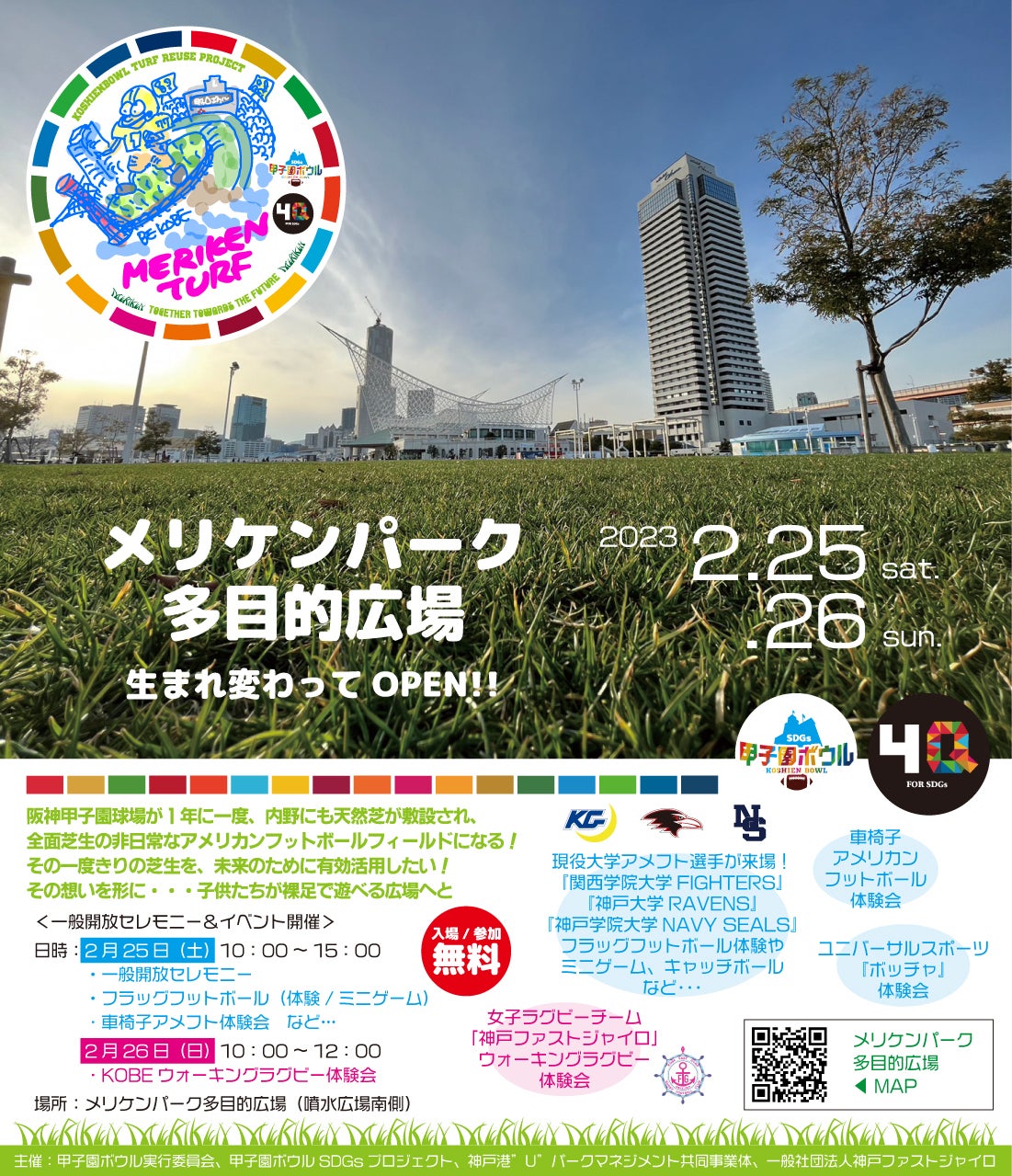 2023/02/24 05:59いよいよ芝生広場開設となります。ぜひ現地にお越しください。【今月 25日(土)/26日(日)】甲子園ボウルの芝生を移設したメリケンパーク多目的広場が生まれ変わってOPEN甲子園ボウル実行委員会及び甲子園ボウルSDGsプロジェクト、神戸港“U”パークマネジメント共同事業体は、全日本大学アメリカンフットボール選手権 決勝『第77回甲子園ボウル』で使用した芝生を神戸市波止場町「メリケンパーク多目的広場」に移設することによって、子供たちが裸足で遊び、スポーツに触れる機会創出を目的に、クラウドファンディングで皆さまにご協力を呼び掛け、芝生の受け入れ先である神戸市様、関連団体・企業様と共に実現する事が出来ました。昨年12月から芝生の育成及び管理のプロである株式会社チュウブ様のご協力と神戸港“U”パークマネジメント共同事業体、及び関連企業様により、芝生広場の一般開放に向けて肥料・水まき、雑草取りを皆の力で繰り返し実施した結果、根付きも順調に進み、この活動の成果として、多目的広場を一般開放いたします。一般開放に先駆けまして、甲子園ボウル覇者である関西学院大学、近隣にキャンパスを持つ神戸大学、神戸学院大学アメリカンフットボール部の皆様、女子ラグビーチーム「神戸ファストジャイロ」の皆様にもご協力頂き、一緒になって芝生に触れて、走り回れるコンテンツを集め、また、日本でも新たなスポーツとして注目されてつつある「車椅子アメフト」や「ウォーキングラグビー」の体験会も実施予定です。ぜひ、皆様、当日はメリケンパークにお越しください!■メリケンパーク多目的広場 一般開放セレモニー&イベント実施概要<日 時>2023年2月25日(土) 10:00〜15:002023年2月26日(日) 10:00~12:00 <場 所>神戸港メリケンパーク多目的広場(兵庫県神戸市中央区波止場町2)<内 容> 参加無料25日(土) ・一般開放セレモニー・フラッグフットボール(体験、ミニゲーム)・車椅子アメフト体験会 など26日(日)・ウォーキングラグビー体験会 他@kobe_u_park @kobe_fastgyro @kgfighters @ravens_kobe @navy__football #甲子園ボウル #americanfootball #アメリカンフットボール #アメフト #フラッグフットボール #flagfootball #車椅子アメフト #車いすアメフト #wheelchairfootball #walkingrugby #ウォーキングラグビー #天然芝 #芝生 #sdgs #メリケンパーク #merikenparkkoshienbowl 甲子園ボウル作成者: 鈴木 康藏 · 1日 · もっと見るクラファン最終日!皆様のご協力に心から感謝します!