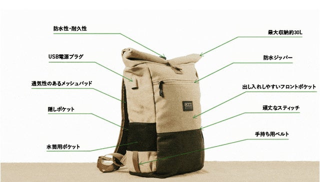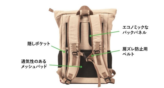 「Hemp Backpack」は、拡張機能があり、上部のフックを外すと最大30Lまでサイズアップできます。着替えやカメラ、シューズなど、週末の休暇に必要なあらゆるアイテムを、よくばりに収納できます。