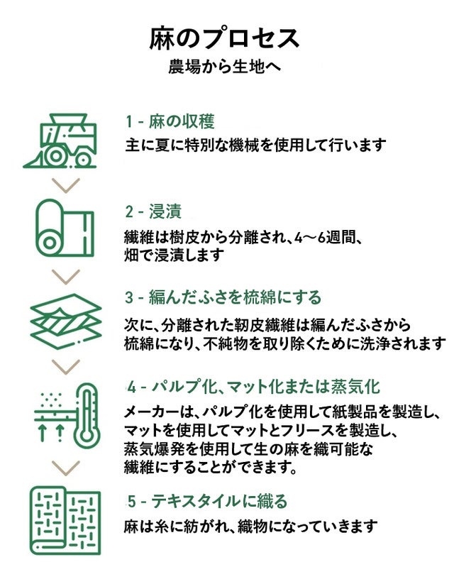 生地は、サティバの枝を原料とする天然ヘンプから作られています。ヘンプは紀元前8000年から使用されている自然素材です。