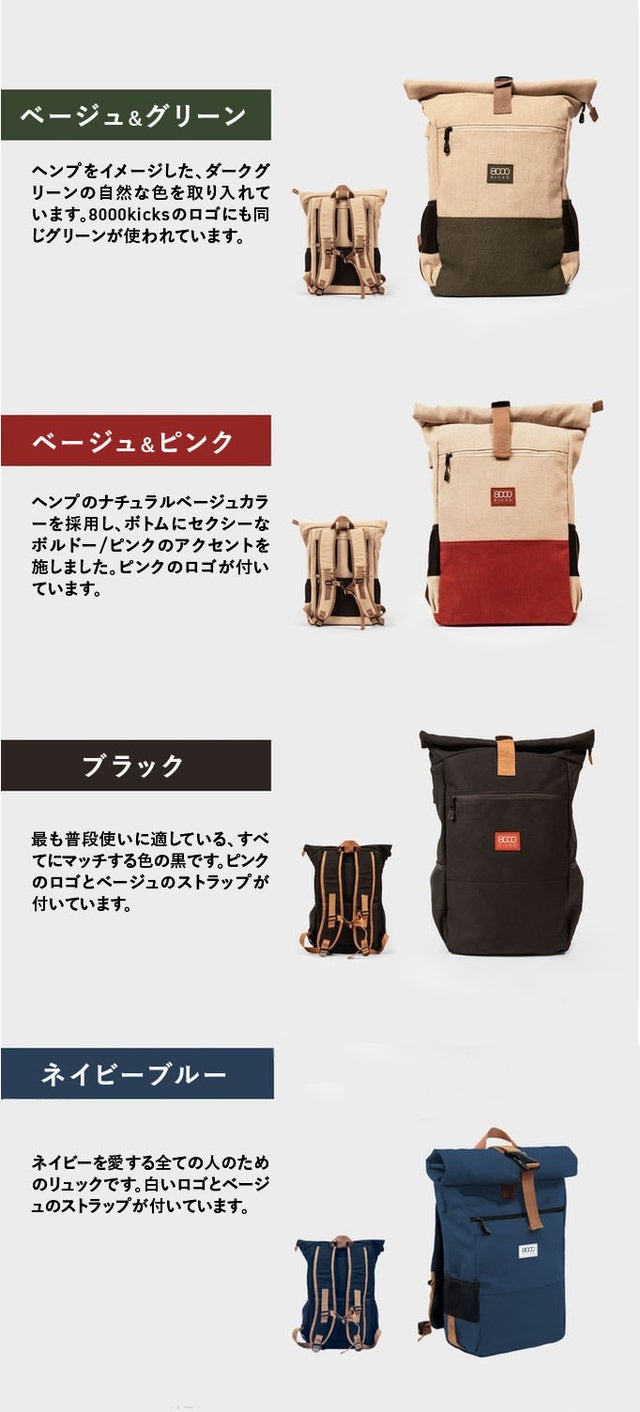 「8000Kicks」は、環境保護とヘンプ(麻)製品の両立を目指すメーカーです。米国クラウドファンディングKickstarterで合計5,000万円以上の資金調達に成功し、アメリカで大ヒットした「Hemp Backpack」が遂に日本初上陸です。