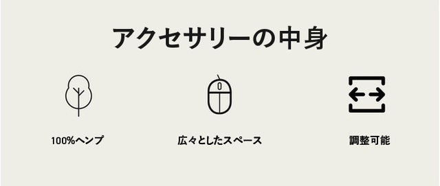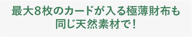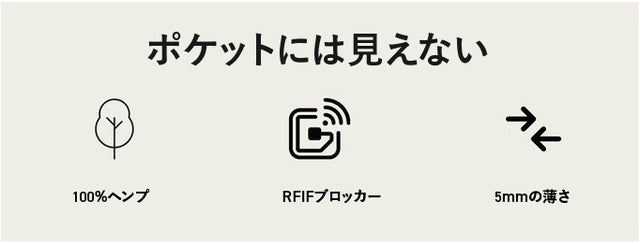 キャッシュレス時代の財布に求められるのはカードの収納力と薄さ。バックと同じヘンプ素材で作られたこの財布は、厚さわずか5mmと極薄ながら、麻財布を最大8枚のカードと紙幣を入れて持ち歩けます。色は黒、緑、ベージュがあります。