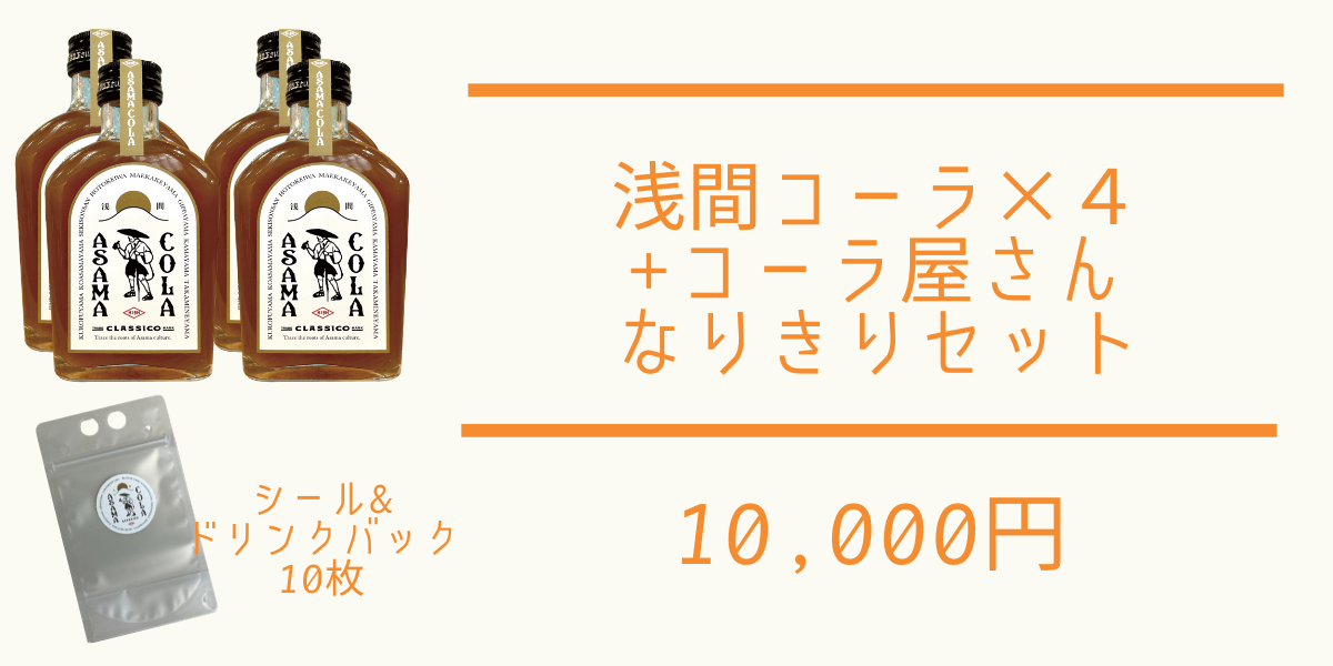 ⑦浅間コーラ原液シロップ(200ml)4本+ コーラ屋さんなりきりキット(オリジナルステッカー10枚&ドリンクパック10枚) 10,000円