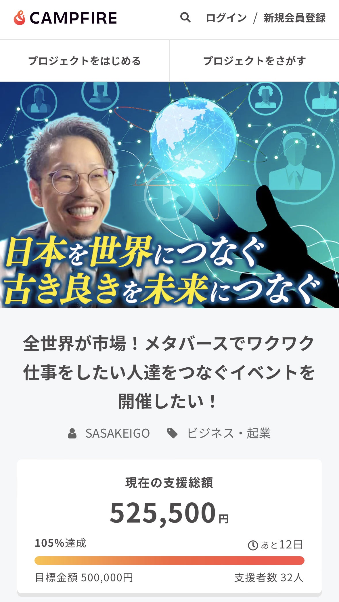2022/10/20 18:00ご支援とご協力誠にありがとうございます。おかげさまで、目標額達成することができました。心から感謝申し上げます。ありがとうございました。みなさまからの期待に責任を持って、本気で取り組むため、もう一段このプロジェクトの飛躍とスピードアップを図るべく、皆さまのSNS等で拡散いただければ嬉しく思います。メタバースを説明するのは、ほんと困難でありますし、さらにご支援となるとハードルが高いため、以下の動画とクラファン内の記事をご覧いただき、変わったことをしている税理士がいるとお伝えください。以下、動画URLとクラファンのURLです。YouTube動画https://m.youtube.com/watch?v=oS_XtFuaCqEクラファン記事ですhttps://camp-fire.jp/projects/view/625032 もっと見る