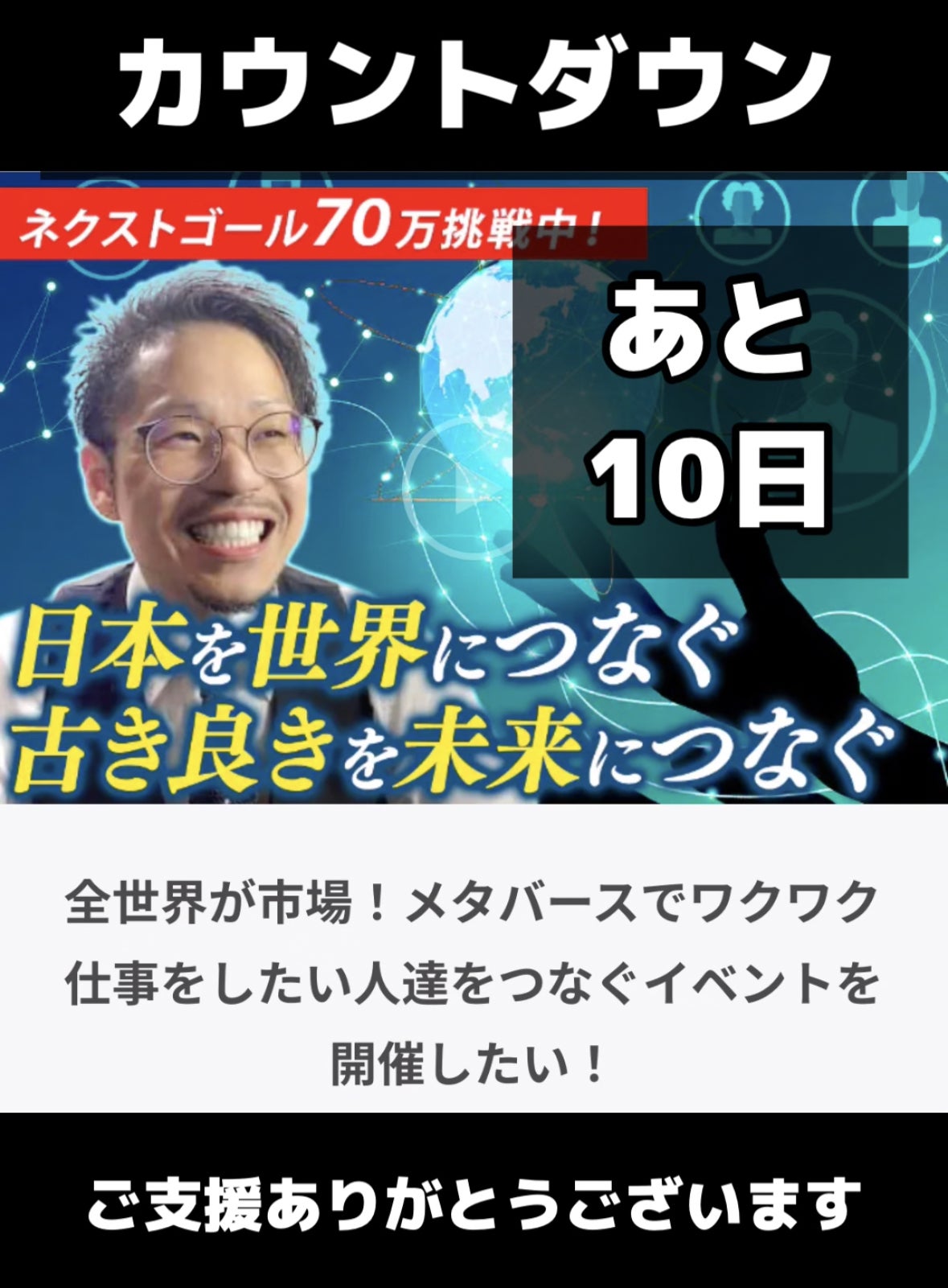 2022/10/18 18:00大文化祭のクラファン大達成です。皆さん、ご支援ご協力ありがとうございます。メタバースはまだ早い⁇と言われがちですが、TikTokも僕が始めた頃は同じように言われていました。プロジェクトをより具体化して到達スピードを加速させます。ご協力・協業いただける方はDM下さい。また、クラファンも引き続き拡散等にご協力いただけると幸いです。僕に翼を大きな翼を下さい。大文化祭動画https://m.youtube.com/watch?v=oS_XtFuaCqEぜひ、クラファン記事を今一度お読みください。https://camp-fire.jp/projects/view/625032※ クラファンリターンで「事務運営メンバー参加権」12万円は一年間の前払いです。こちら、クラファン時にしか募集しないものになります。ゴールド会員との違いはホストかゲストかになります。価格は同じで期間が違うものです。また、事務局メンバーはゴールド会員にもなれるという無敵権利です。SAMURAIバースプロジェクトのホスト側に回ることで大きい企業とも対話できたり、知見や人脈が拡がったりとメリットがたくさんあります。ぜひこの機会に検討して下さい。ご不明な点は無料体験会などにご参加いただくかDMしてくださいませ。https://docs.google.com/forms/d/e/1FAIpQLSeMy8nZctz6UES5W6qNO4pU_n2Cson_9UHFCnlBzEBLyAVNuA/viewform もっと見る