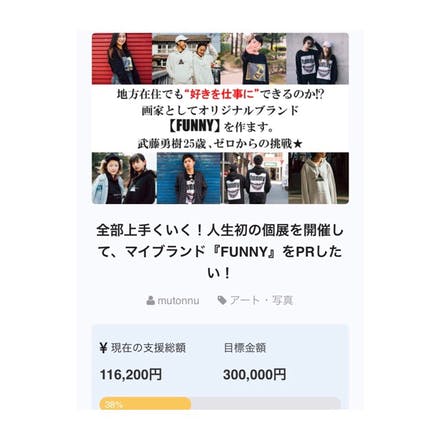 2018/04/04 13:15こんにちわ! むとうです。 【クラウドファンディングのお礼】 先月13日に終了しましたクラウドファンディングですが 総額21万円もの支援金額を集めることができました。 ご協力頂きました皆さん改めてありがとうございました! Tシャツ、パーカー、スウェットをご購入いただきました方へは 昨日今日で発送完了予定ですので楽しみにお待ちください(^^) その他リターンをご購入いただきました方に関しても 追って発送準備に取り掛かっていきます。 【FUNNY展の詳細完成しました!】 21(土)GUEST ★LuCifeR(アイドル) ★山口あんず(マルチタレント) ★Photo‐G(フォトグラファー) ★Saki(フォトグラファー) ★ART(現代アート作家) ★徳久望(シンガーソングライター) 22(日)GUEST ★冨永ボンド(現代アート作家) ★Photo‐G(フォトグラファー) ★Saki(フォトグラファー) ★徳久望(シンガーソングライター) ★laluce(レザーハンドメイド) ★405(現代アート作家) ★八谷元祝(現代アート作家) ★池田明後日(現代アート作家) ★緑力園(テラリウムアート作家) ★ポン子(現代アート作家) イベントでは僕自身の個展は勿論、 佐賀、福岡で精力的に活動中のアイドルユニット LuCifeRとのコラボ撮影会や 現代アート作家達によるライブペイント また、当日は佐賀を代表する現代アート作家 "冨永ボンド"のアトリエ『ボンドバ開放日』も 同時開催なのでボンドアート体験もできます(^^ クラウドファンディングが一段落したばかりですが 次の目標は今月21(土)、22(日)に開催予定の "FUNNY展"に一人でも多くの来場を頂くことです。 皆さんも是非遊びにいらしてください(^^) それででは今回の活動報告はこの辺で! むとうでした。 もっと見る