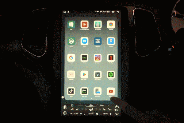純正のダイヤル式での操作から、ハイテックナビでは画面上のACコントロールパネルをタッチしての操作へと進化します。