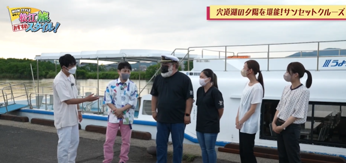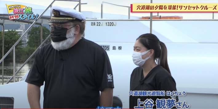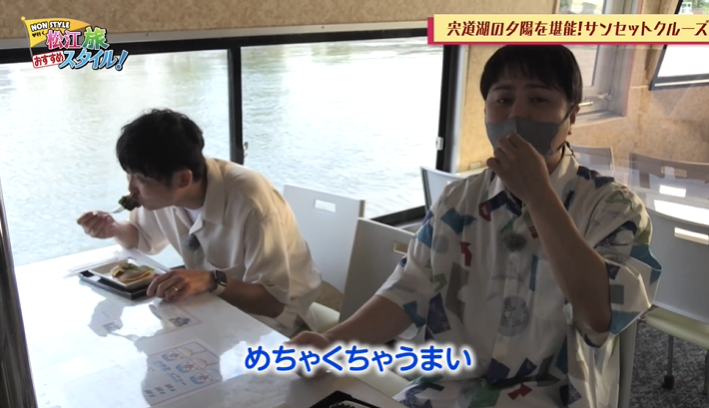 ➣2022年8月 島根銀行さんが提携しておられる吉本興業さんにも協力をしていただきました。松江の観光名所を巡る番組内で「NONSTYLE」さんにもはくちょう号に乗船していただきました。その中でスイーツを試食してもらい好評を頂きました!