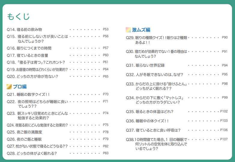 こどもたちが自ら睡眠の現状をチェックすることで、睡眠状況をテストすることができます。また、ただ文字を読んで睡眠を学ぶのではなく、クイズに答え楽しみながら睡眠の知識をつけていくことができる内容です。文字を読める子は自分で進められますし、文字がまだ読めない子は大人と一緒に学ぶことができる内容です。そして、ご自宅でこども自身ができることや家族と一緒にできる眠りのコツを掲載します。