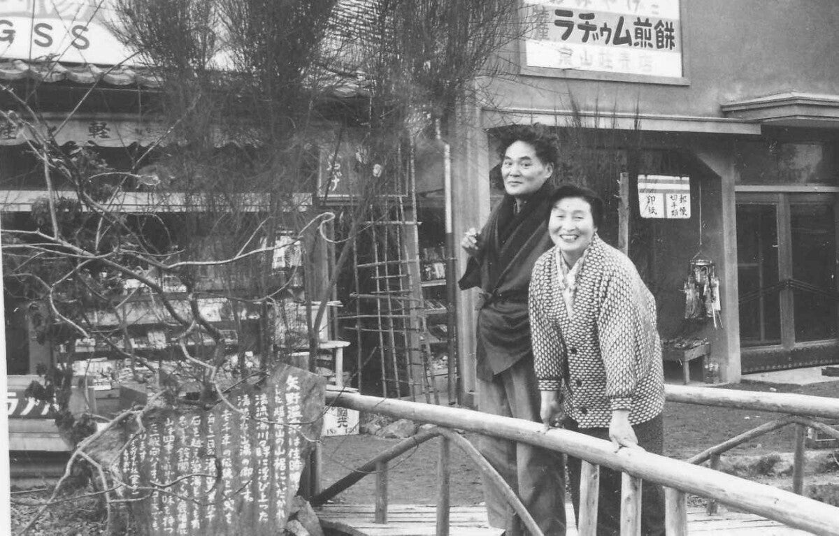 (写真は矢野温泉郷で土産物を始めた頃の創業者 森岡敏之・まさ子)