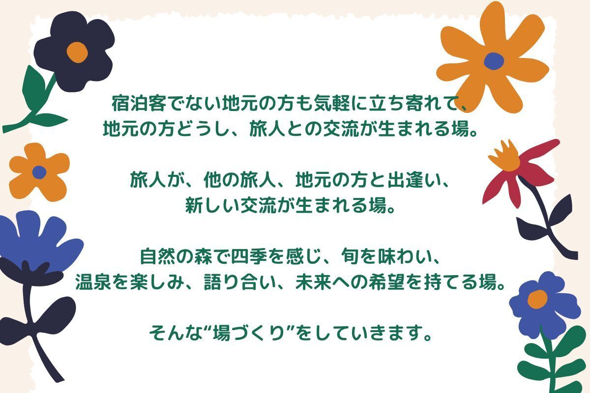 そしてバトンは私の手に渡され、皆さんのお陰で20年目の節目を迎えることができます。この節目を迎えるにあたり、「今の私に何が出来るだろうか、未来を担う若者たちに何か役に立てることができないか」と考えた時、森岡ママが残した家と矢野温泉を復活することで、新しい風を入れる事ができるのではないか、新しい出会いの場を作りたい!と思いが強まってきました。
