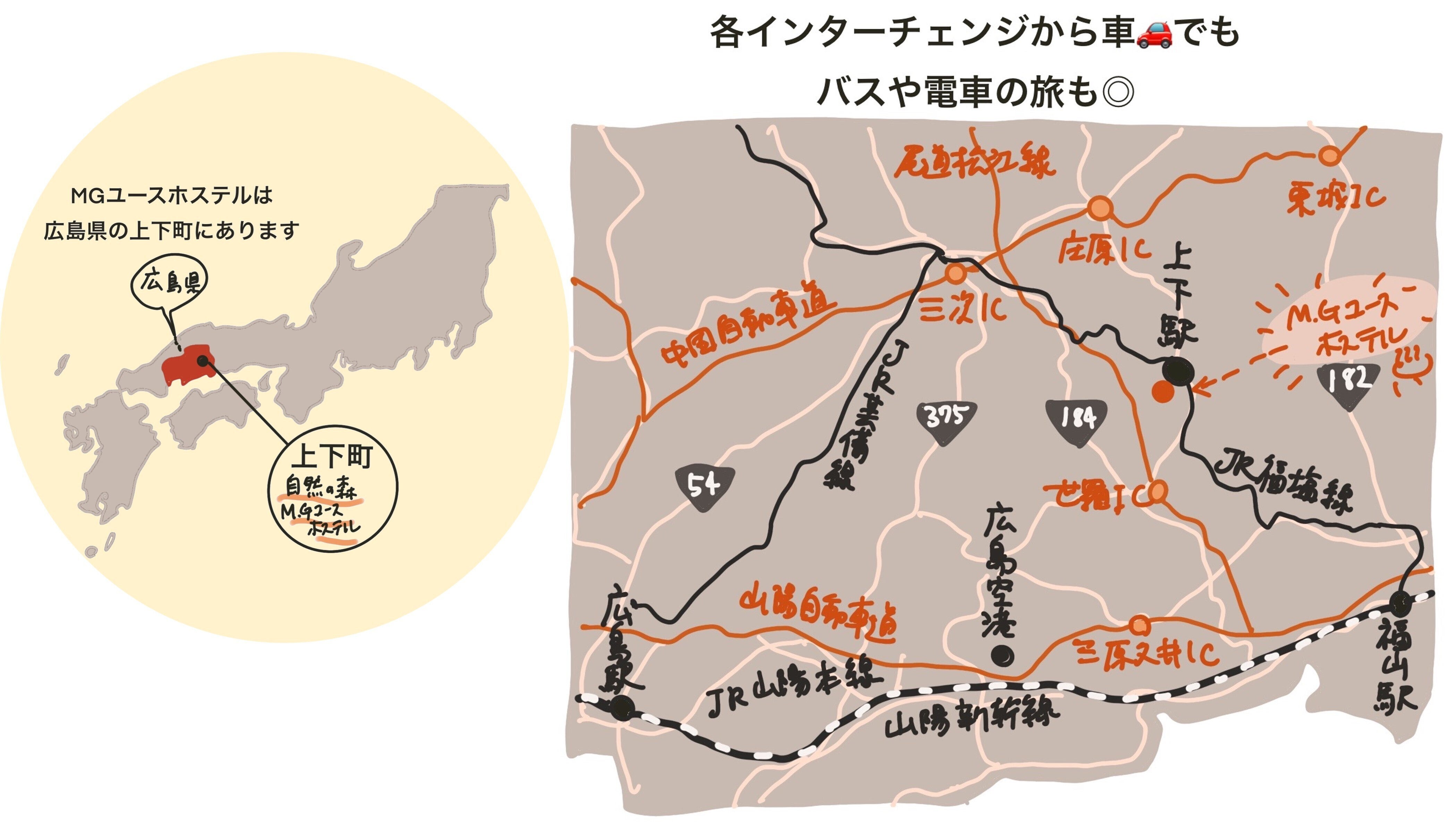 自然の森M.Gユースホステルは中国山脈の緑豊かな山間にある広島県府中市上下町の矢野という地域にあります。1959年、創業者の森岡夫妻が県内では初のユースホステルを開業したのが始まりです。当時のユースホステルは世界中の10代後半から20代の旅をする若者たちが各地の文化や歴史を学ぶ場であり、国際的な教育の場であり、友情の場であり、そして奉仕の場として、青少年の育成の一助を担っていました。その後、時代が移り変わった現在でも、ユース会員以外の方も宿泊できることから、往時の若者たち(現在は50~70代)はもちろん、20・30代の若者たちが集い、新しい出会いを生み出す場となっています。
