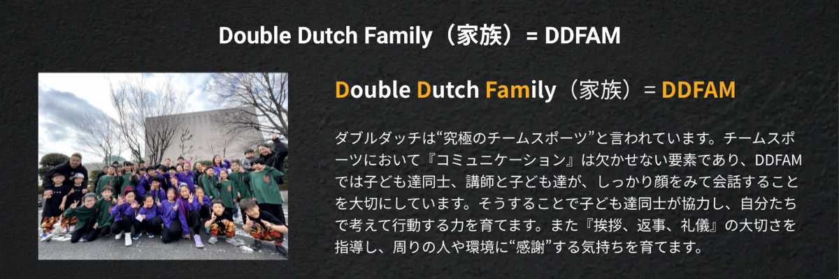2019年3月に「トンデミーヤ」のメンバーが、先生や友達のお誘いでDDFAMの体験レッスンを受け、ダブルダッチにハマり入校しました。