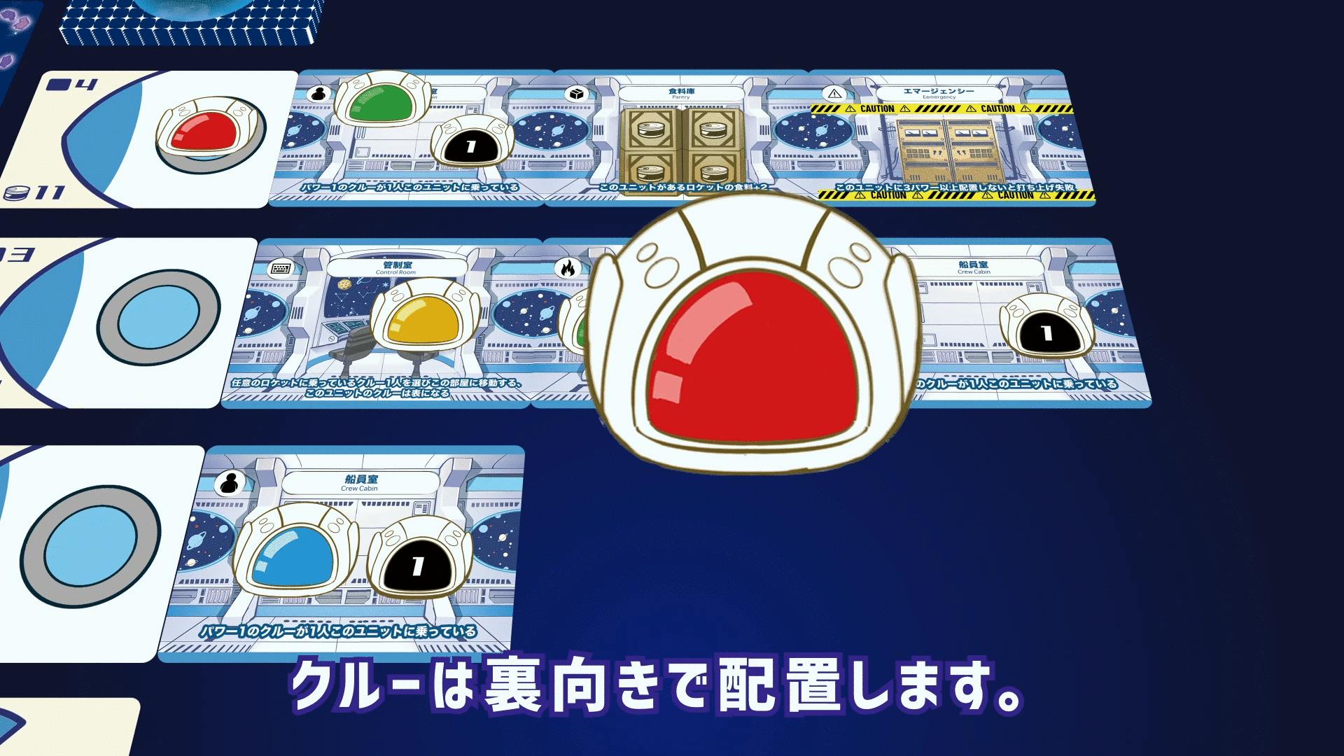 部屋に異常事態が起きたらさあ大変!カードを使ってロケットに部屋を設置したり、クルーをロケットに配置!