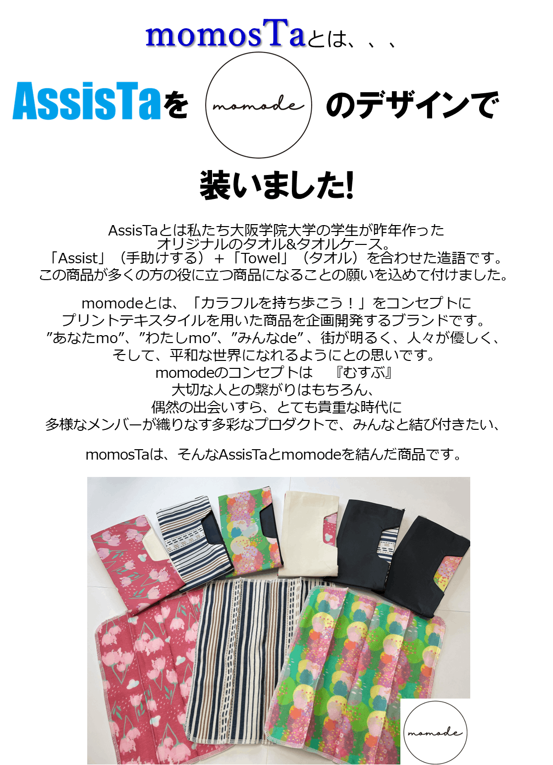 2022/11/14 16:27ご支援・応援くださった方々、大阪学院大学✕ドナルド・マクドナルド・ハウス おおさか健都(おおさか健都ハウス)✕(有)エムズ産学福共同企画、カラフルを持ち歩いて日常に彩りを*カラフルなタオル&多機能ケース momosTa へのご支援ありがとうございました。無事、成功裏にプロジェクトを終了することができました。皆さまの多大なるご支援・ご協力に深く御礼申し上げます。商品については今月中に送付させていただきます。今しばらくお待ちください。皆さまから頂いたご支援は、製造費用等諸経費を除いた利益分を、ドナルド・マクドナルド・ハウス おおさか健都(おおさか健都ハウス)の希望を受けた形で寄付してまいります。また、少しでも寄付できる金額を増やしていきたいため、下記にて対面販売を実施いたします。予定数を販売しましたら追加する予定はございません。気が付いたらクラウドファンディングの期間が終了していた、と思われた方は是非、足を運んでいただければと思います。(1)ハルカス学園祭 ・日時:2022年11月17日(木)10:00~11月21日(月) 15:00 ・場所:あべのハルカス近鉄本店 9F催事場 「ハルカス学園祭」摂南大学田中ゼミ✕momode ブースにて (※大阪学院大学金丸ゼミのブースではありませんので、ご注意ください)(2)大阪学院大学「くわい祭り」 ・日時:2022年12月4日(日)10:00~ ・場所:大阪学院大学構内今後の活動につきましては、下記にて紹介してまいります。お気に入り登録等いただければうれしいです。https://twitter.com/TeamOAM_OGU改めてご支援くださった皆様に感謝いたしますとともに、引き続き、TeamOAM_OGU の活動にご支援・ご協力をいただけますと幸甚です。どうぞよろしくお願いいたします。TeamOAM_OGU 担当教員 葛西恵里子 もっと見る