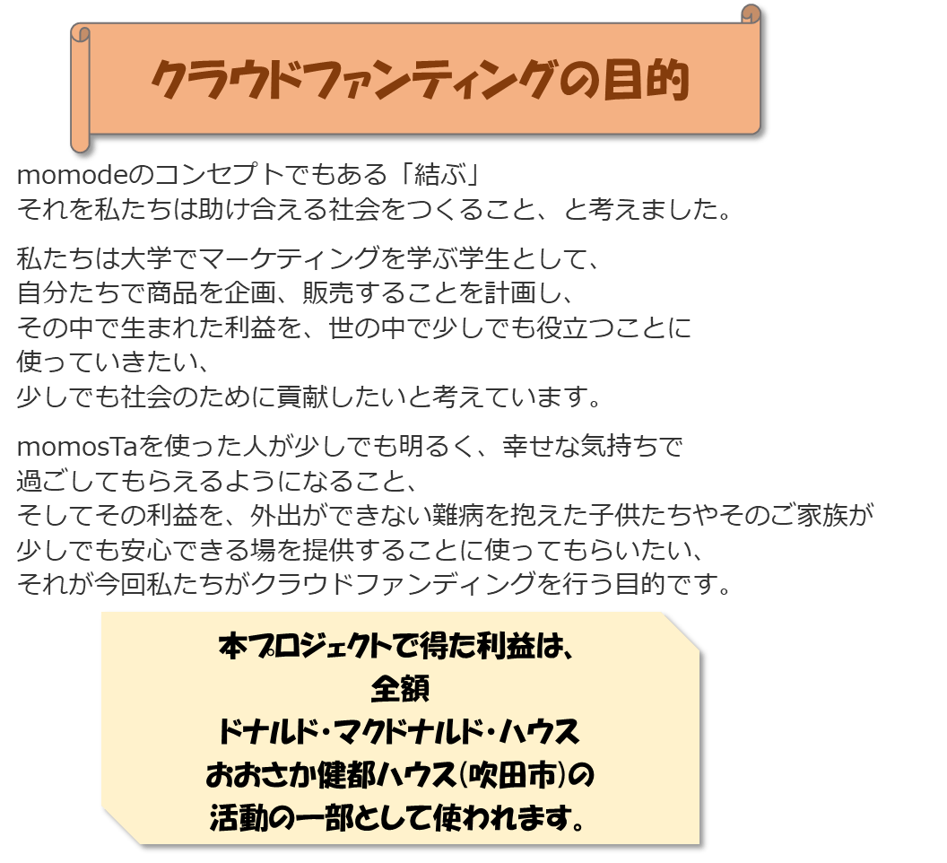 そして今回、ドナルド・マクドナルド・ハウス おおさか健都(おおさか健都ハウス)・(有)エムズ の協力の下、1人でも多くの人に気持ちが明るくなる商品をと、共同でmomosTaを開発しました。