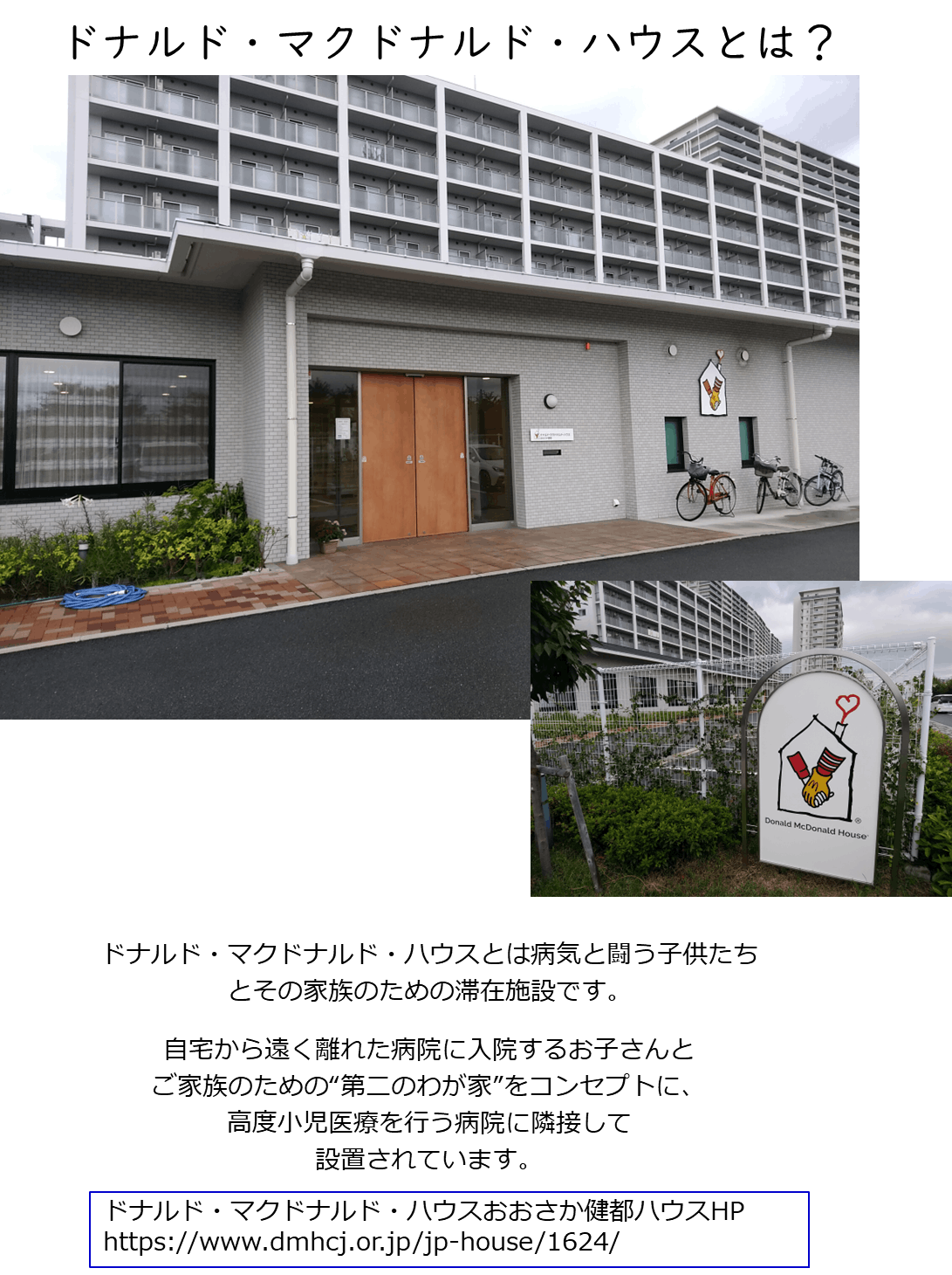 ※ドナルド・マクドナルド・ハウスおおさか健都ハウスは、本取組みを共同企画とし、当学から備品を寄贈すること、及び名称掲載の同意を得ております。