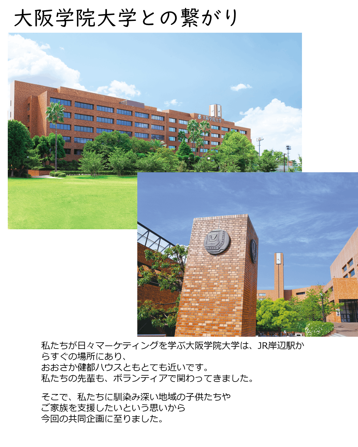 ※大阪学院大学は同学の葛西ゼミが当プロジェクトを行うことを了承しており、その際に大学名称・ロゴ・画像を使用することの同意は得られています。